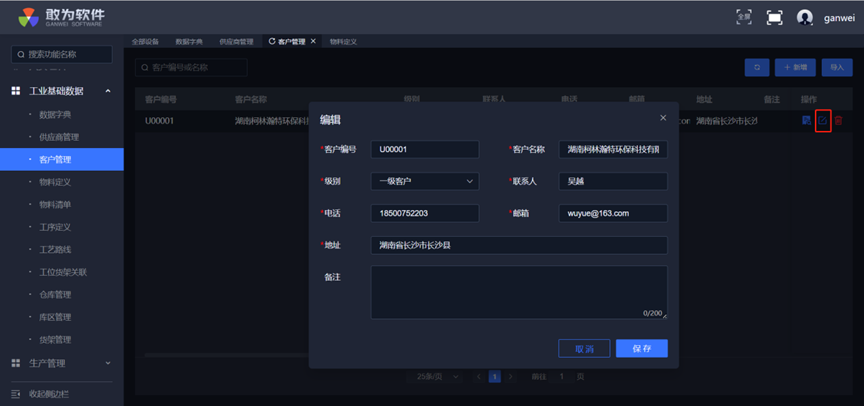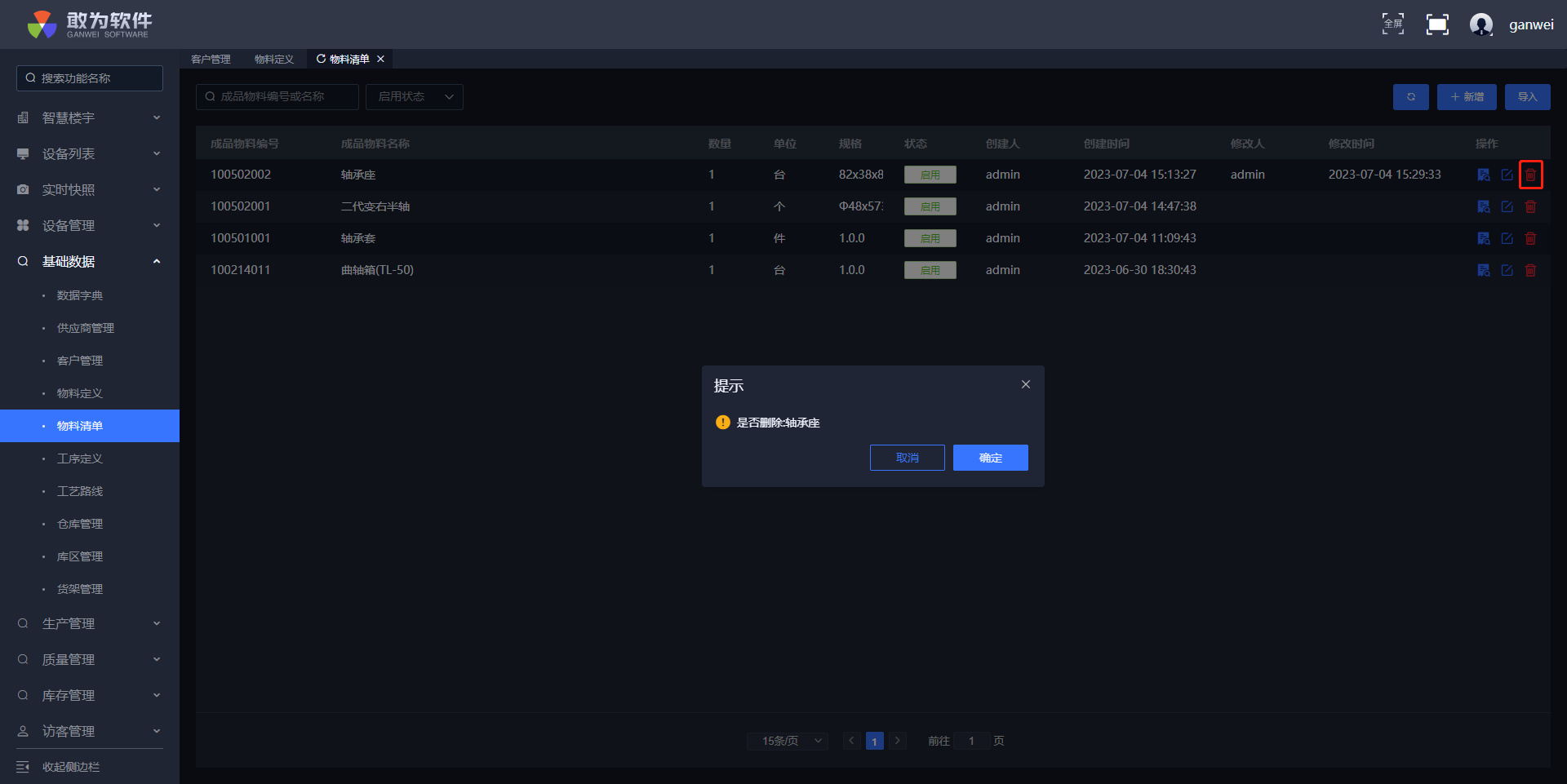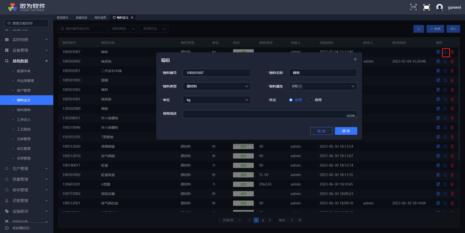点击列表中的修改按钮,在弹出页面修改物料清单信息,点击保存。