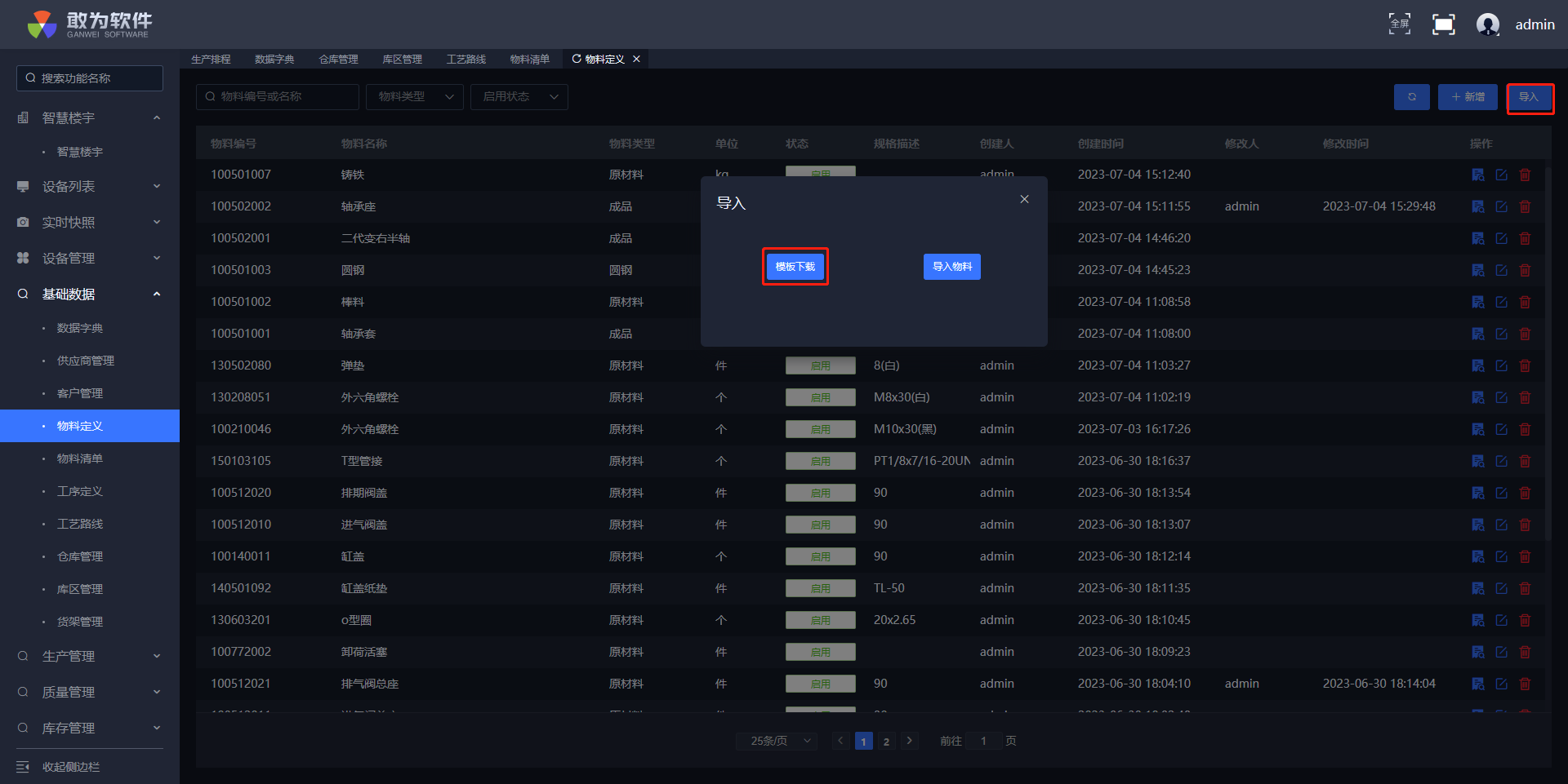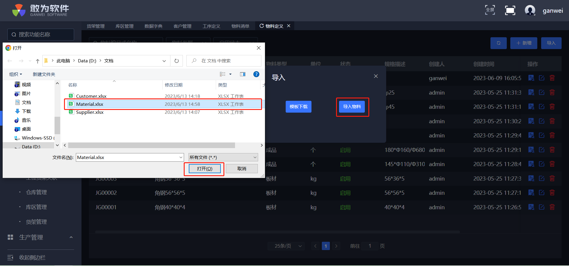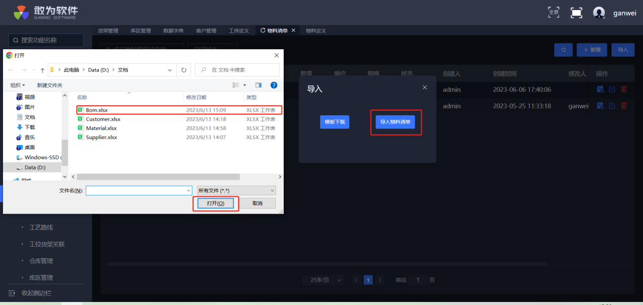 点击导入物料按钮,选择已修改好的文件。即可导入成功。