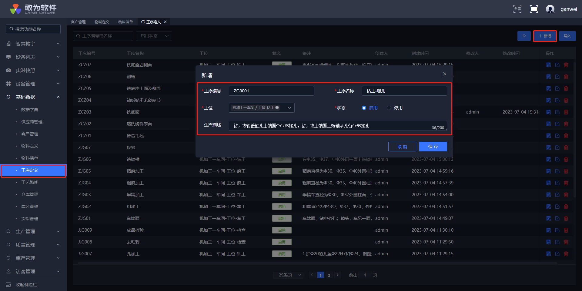 在弹出层中输入工序信息,点击保存。工位信息在人员组织机构