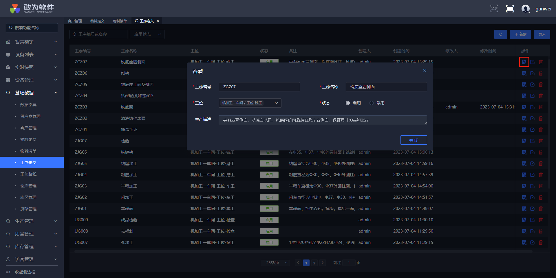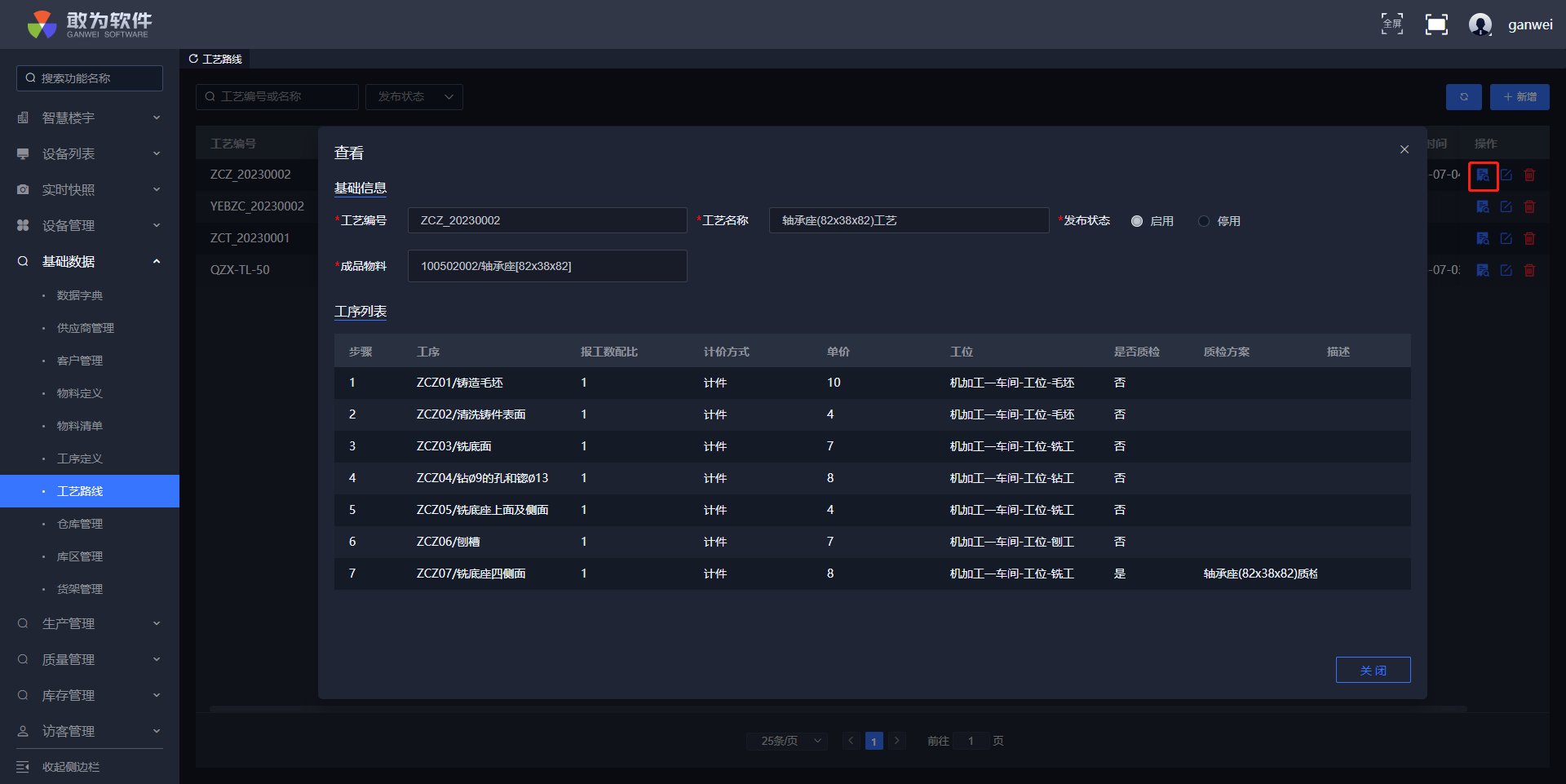 点击列表中的查看按钮,即可查看当前工艺路线对应的工序的详情数据。
