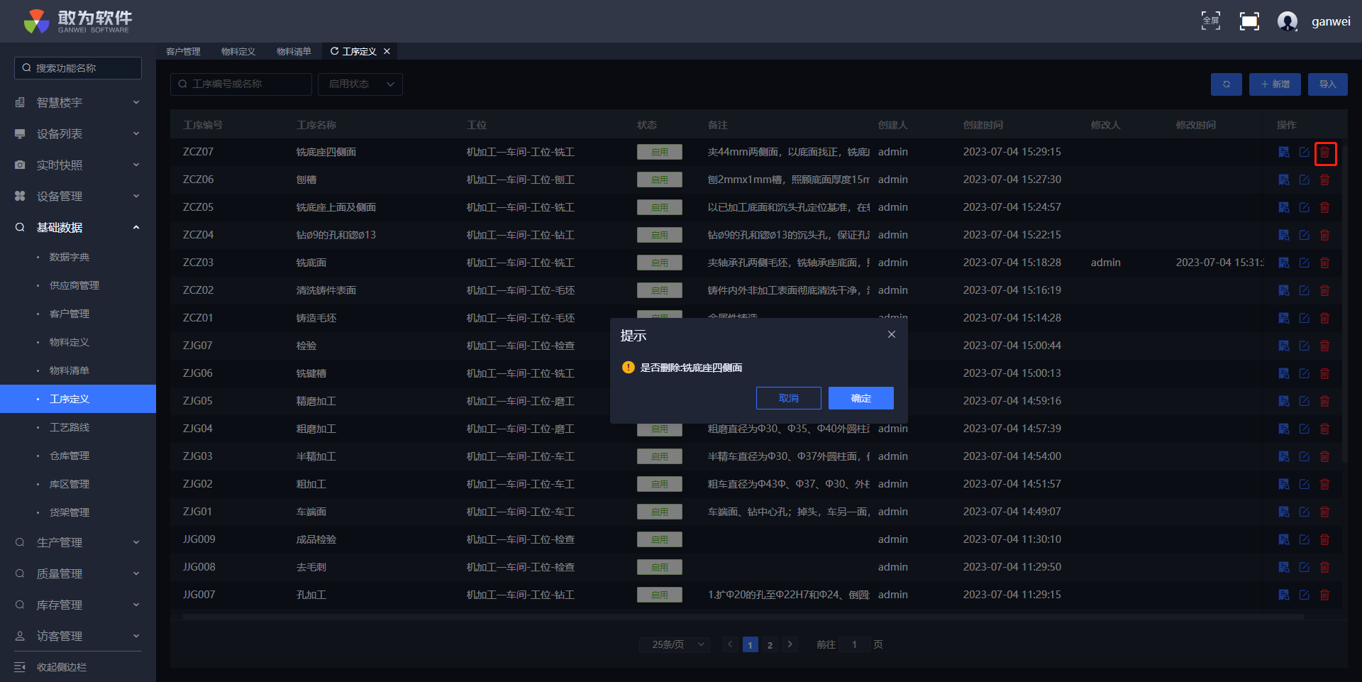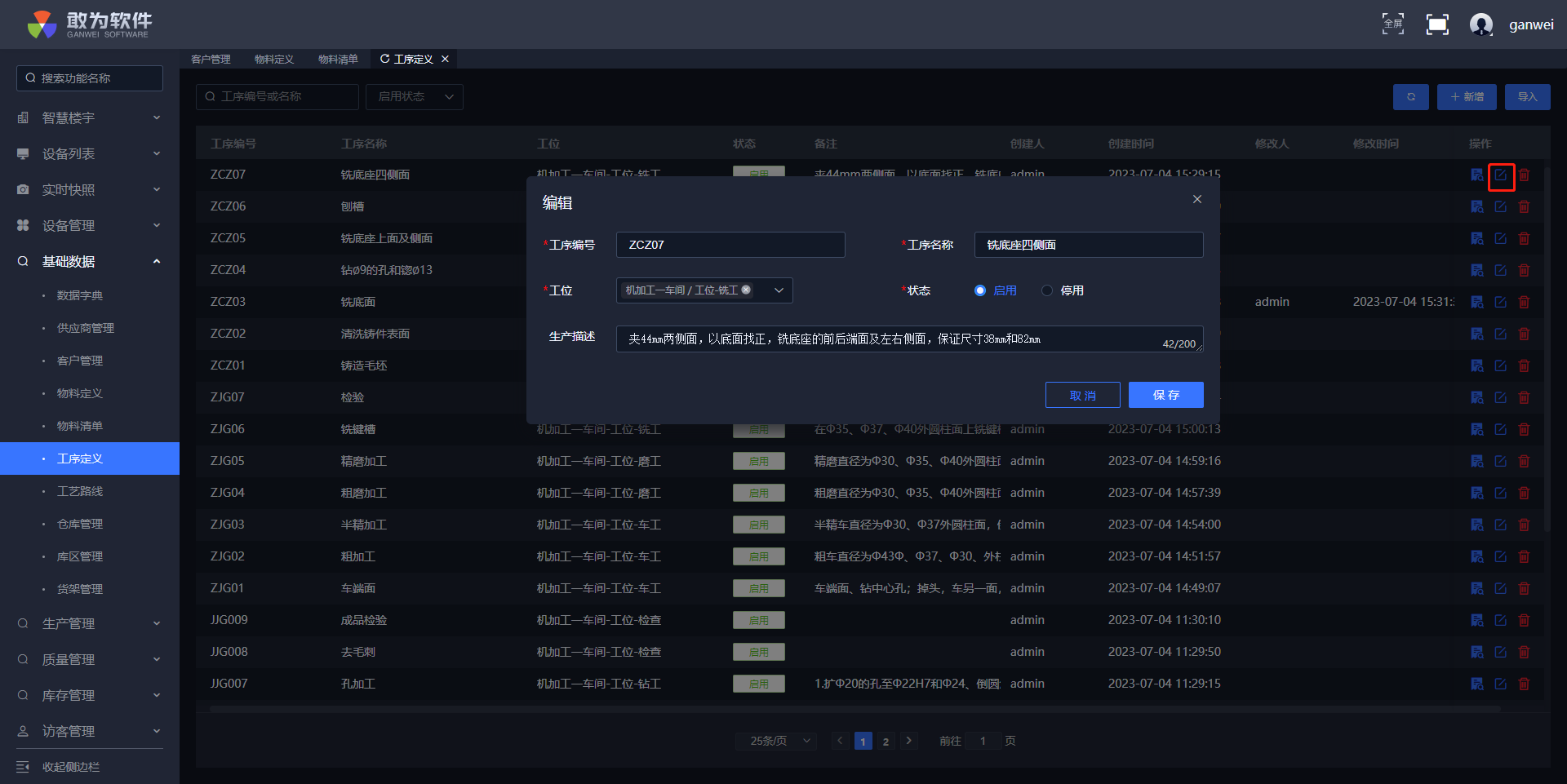 点击列表中的修改按钮,在弹出页面修改工序信息,点击保存。
