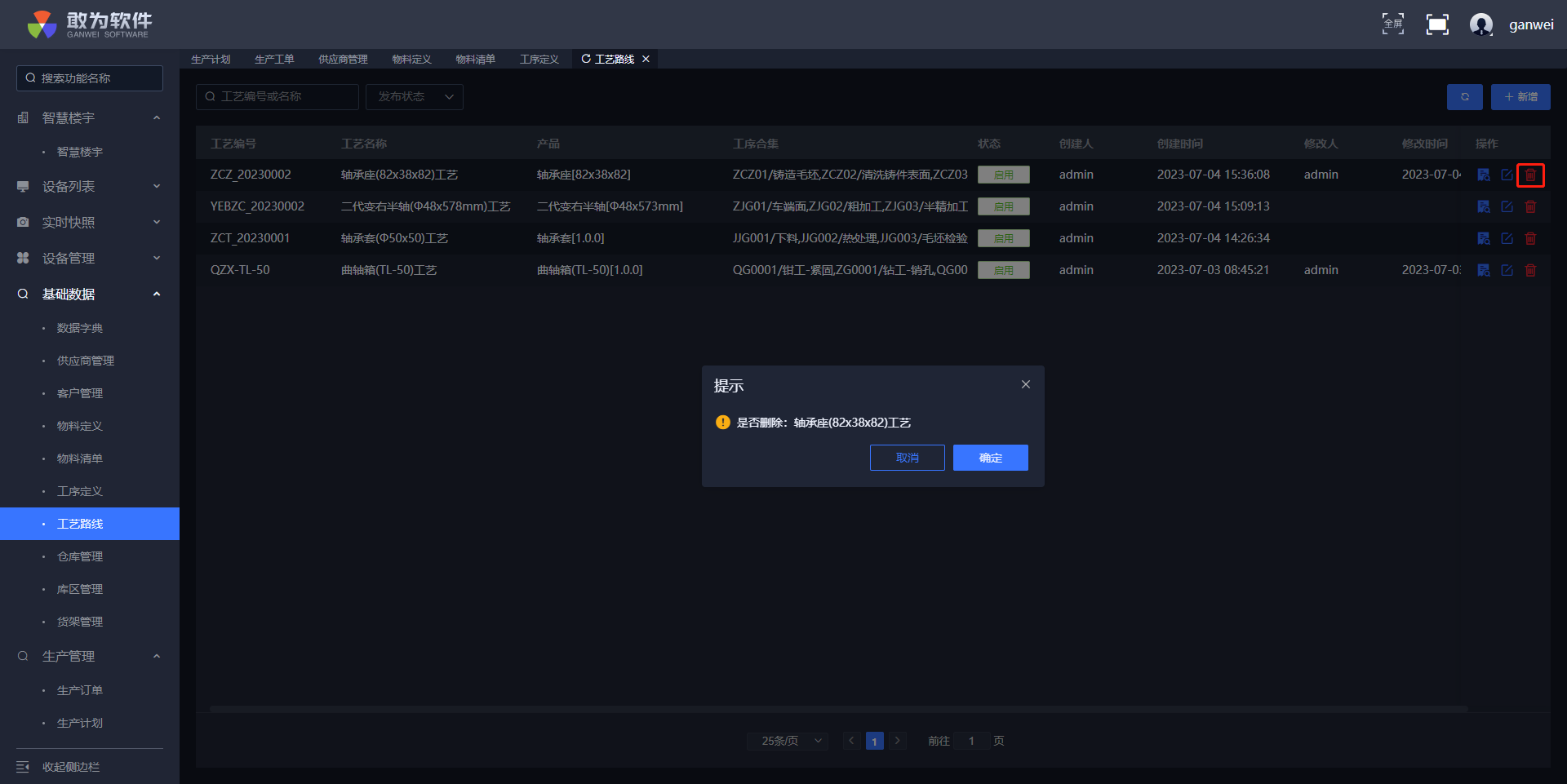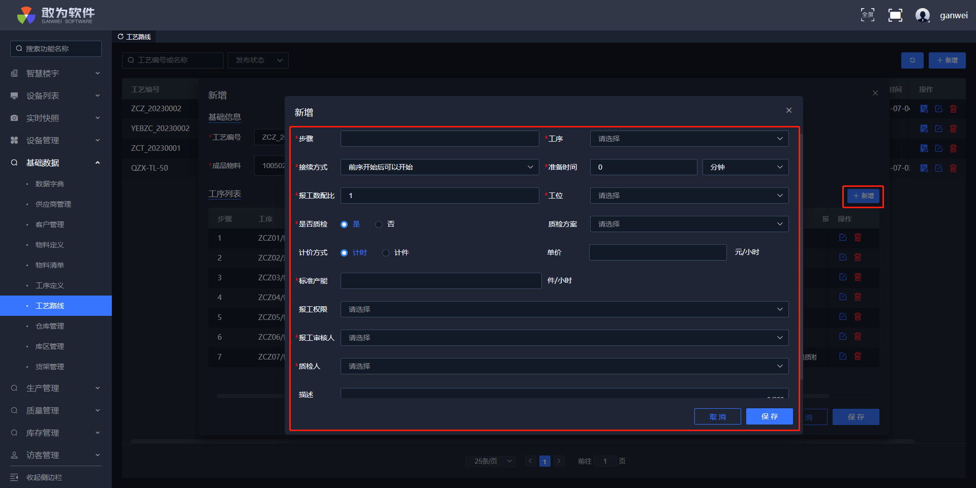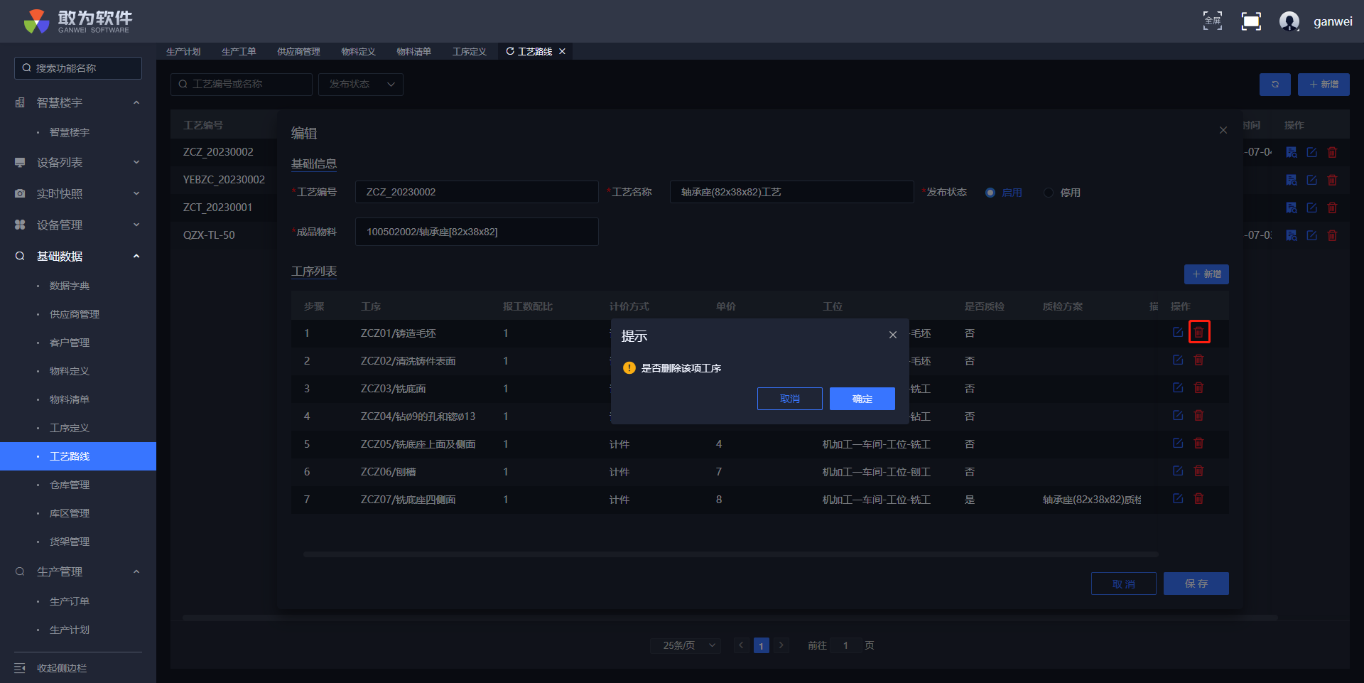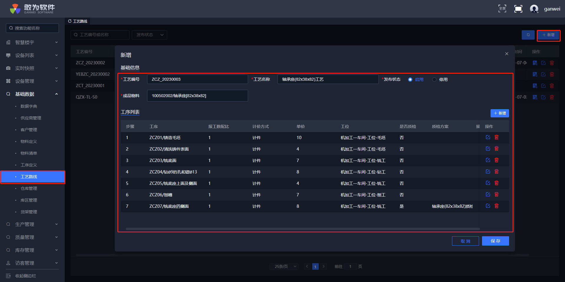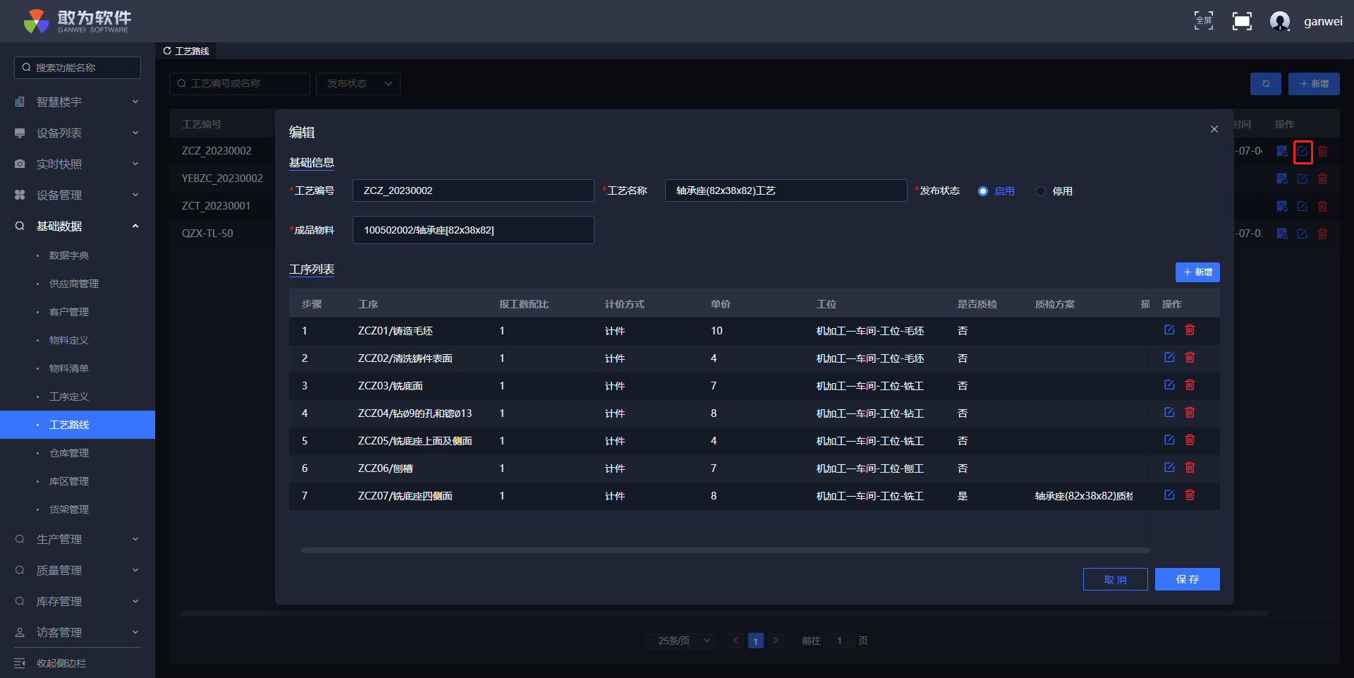 点击列表中的修改按钮,在弹出页面修改工艺路线信息,点击保存。