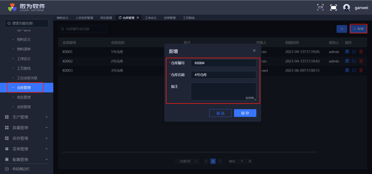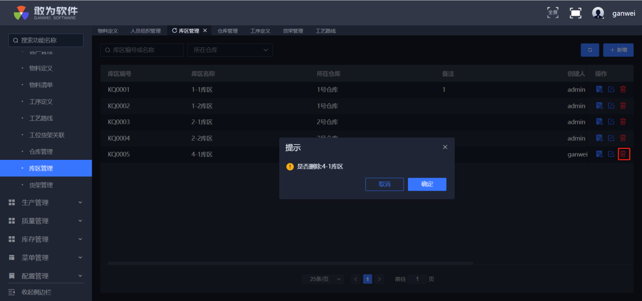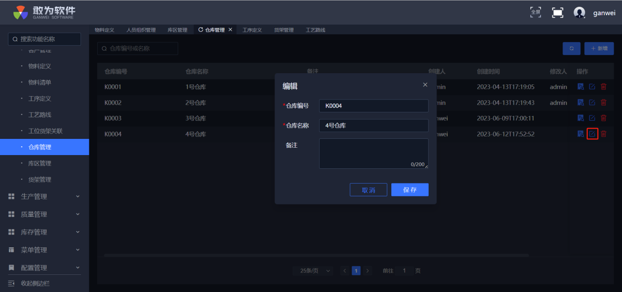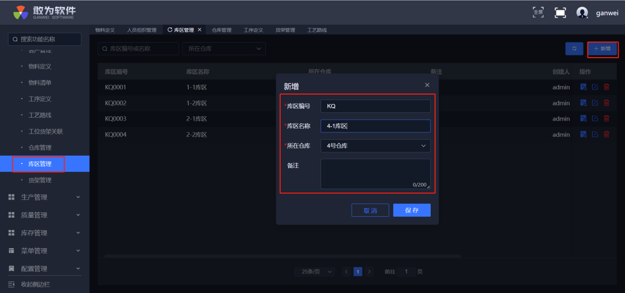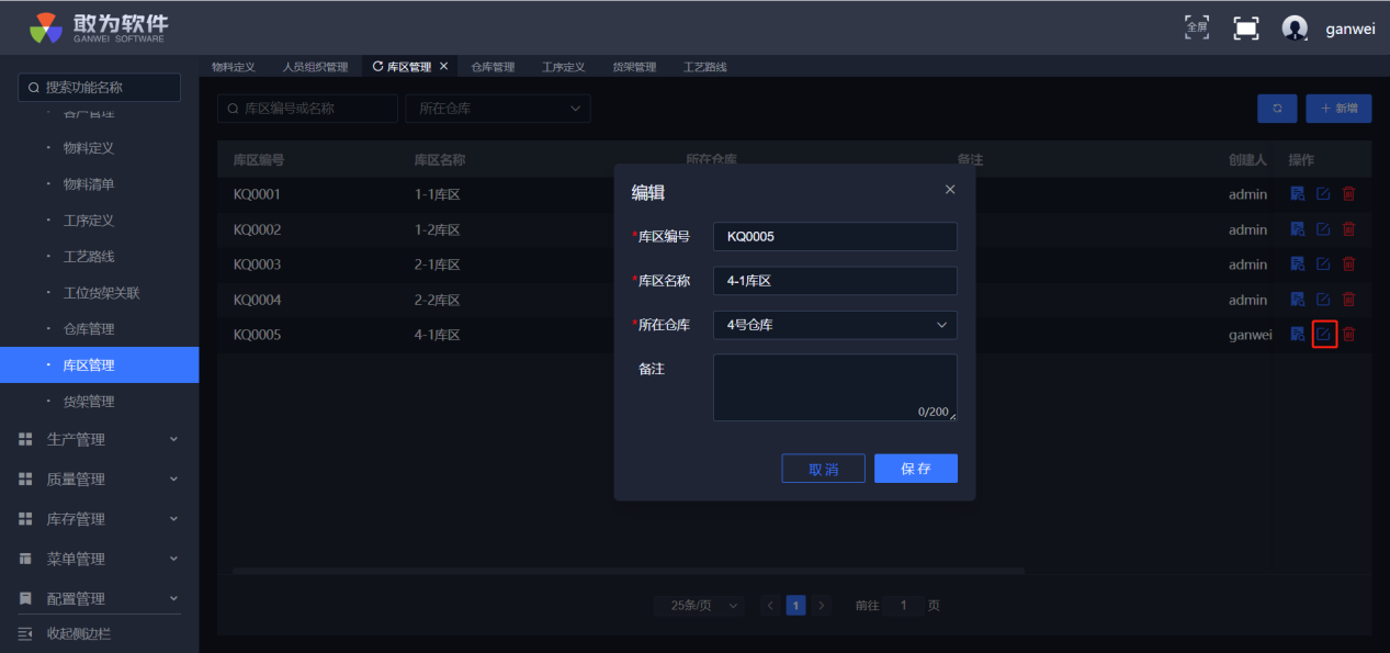 点击列表中的修改按钮,在弹出页面修改库区信息,点击保存。