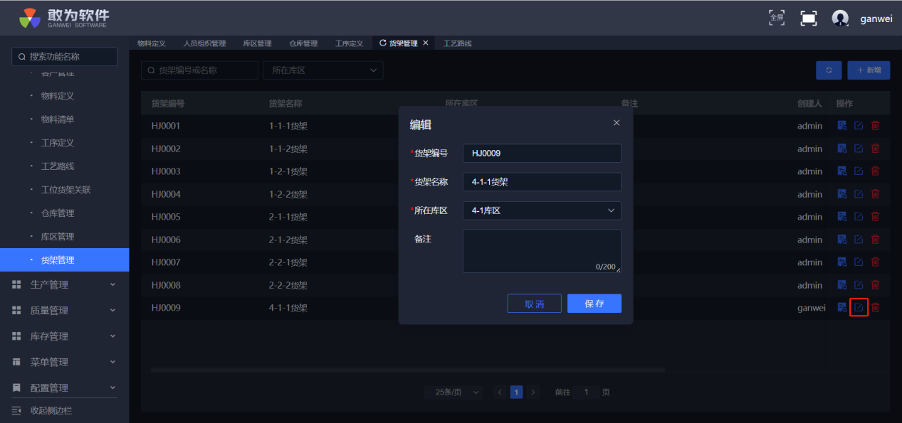 点击列表中的修改按钮,在弹出页面修改货架信息,点击保存。