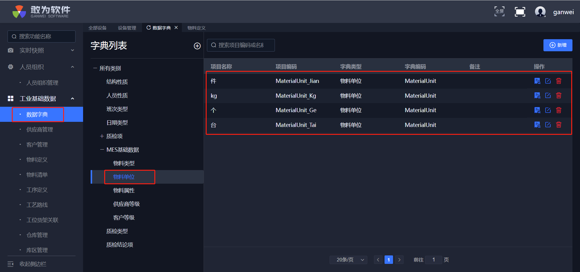 物料单位的code为MaterialUnit。物料单位是指涉及多个单位的单位,如库存、销售、采购、重量等,也可根据需求自定义物料单位。设计“物料单位”字典,将所有的单位统一管理,并统一口径输入;在其他相应使用地方,通过“下拉框”形式实现单位的维护。