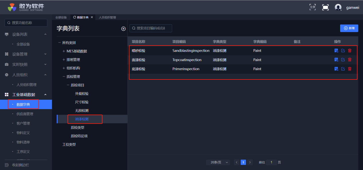 在左侧找到质检项目,选择质检项目中的油漆检测。