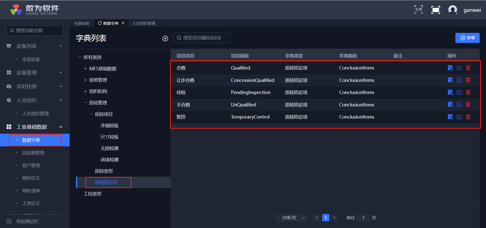 质检结论项code为ConclusionItems。质检结论项分为合格、不合格、待检、让步合格等也可自定义质检结论项。