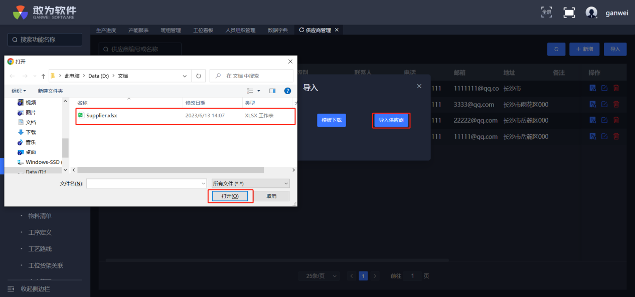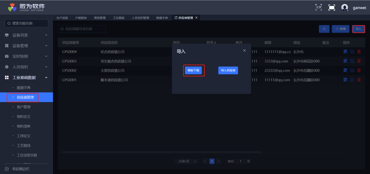 在弹出层点击下载模板。根据模板添加完供应商数据后。点击导入供应商,选择中文件即可导入
