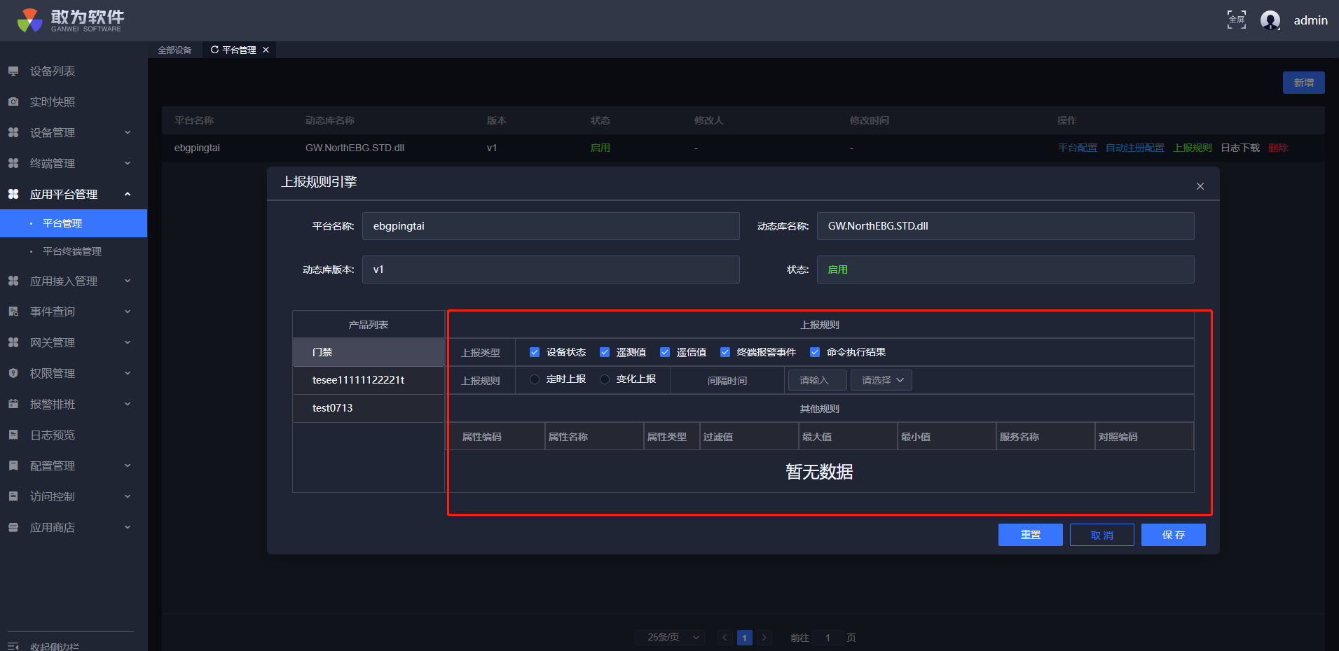 状态上报规则:定时上报和变化上报,其中变化上报的规则中配置的“时间间隔”为设置时间内两次状态变化间隔多久内不上报。当前上报规则只对设备状态有效。