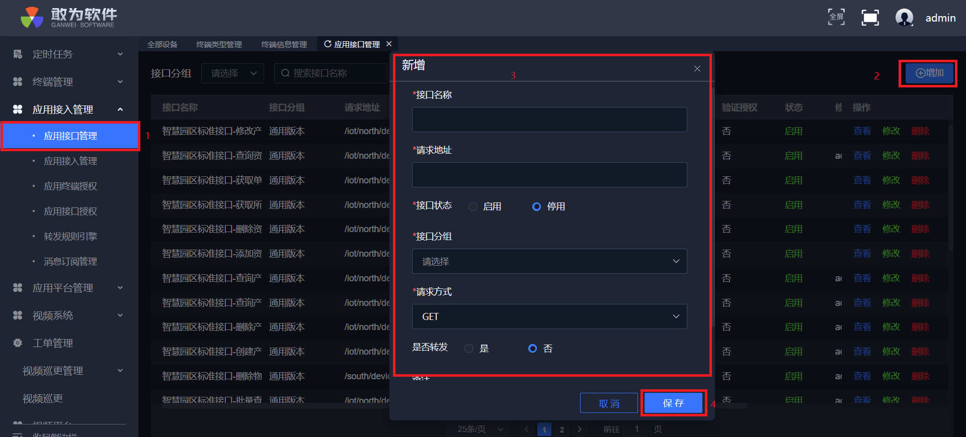 管理北向应用可以访问的北向接口,可以新增接口、修改、删除接口。在应用调用北向接口是,首先判断接口是否在该范围中,如果不在该范围,应用是无法调用成功的。