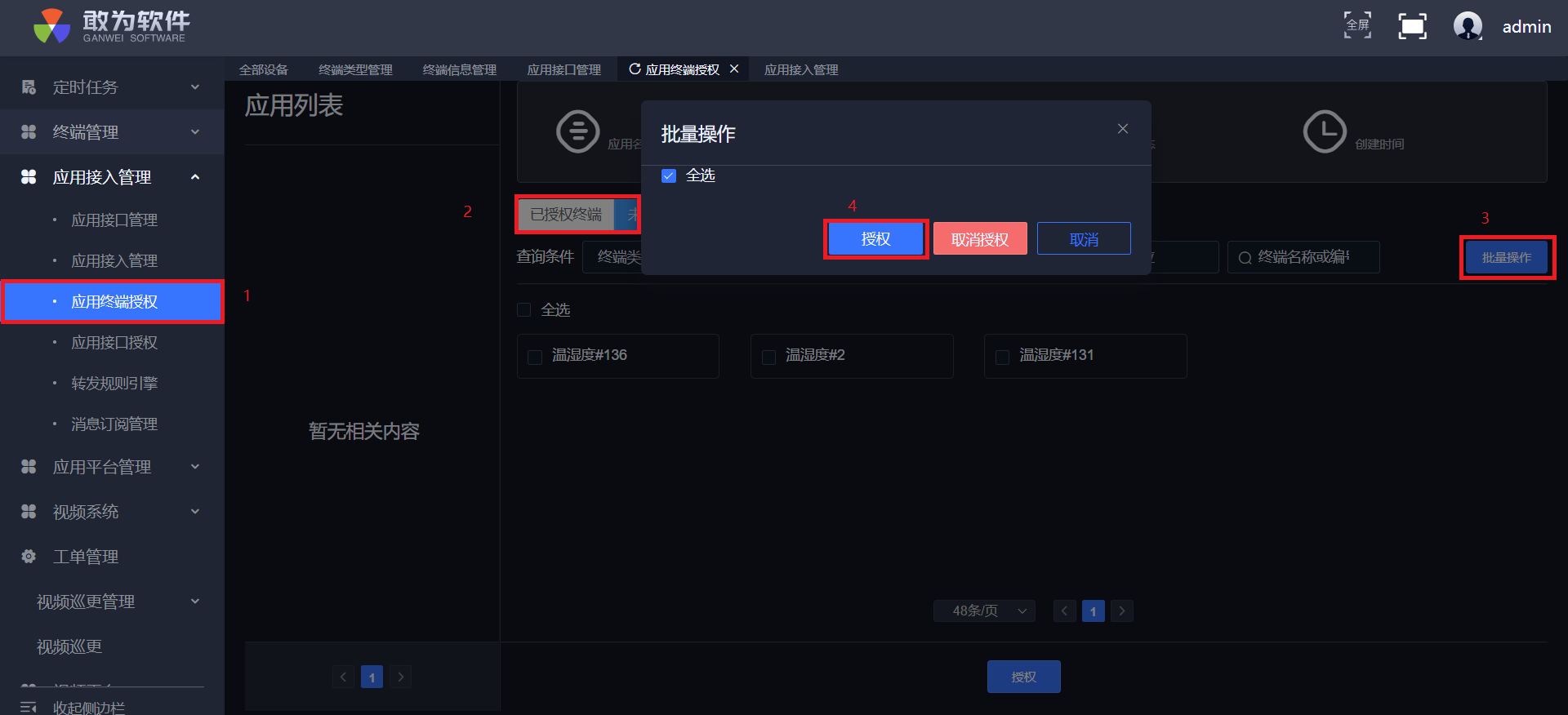应用创建后,用户可以对应用授权终端,可以按终端类型进行全选或者自定义选择。只有应用授权后的终端,应用才可看和可控可进行批量操作。