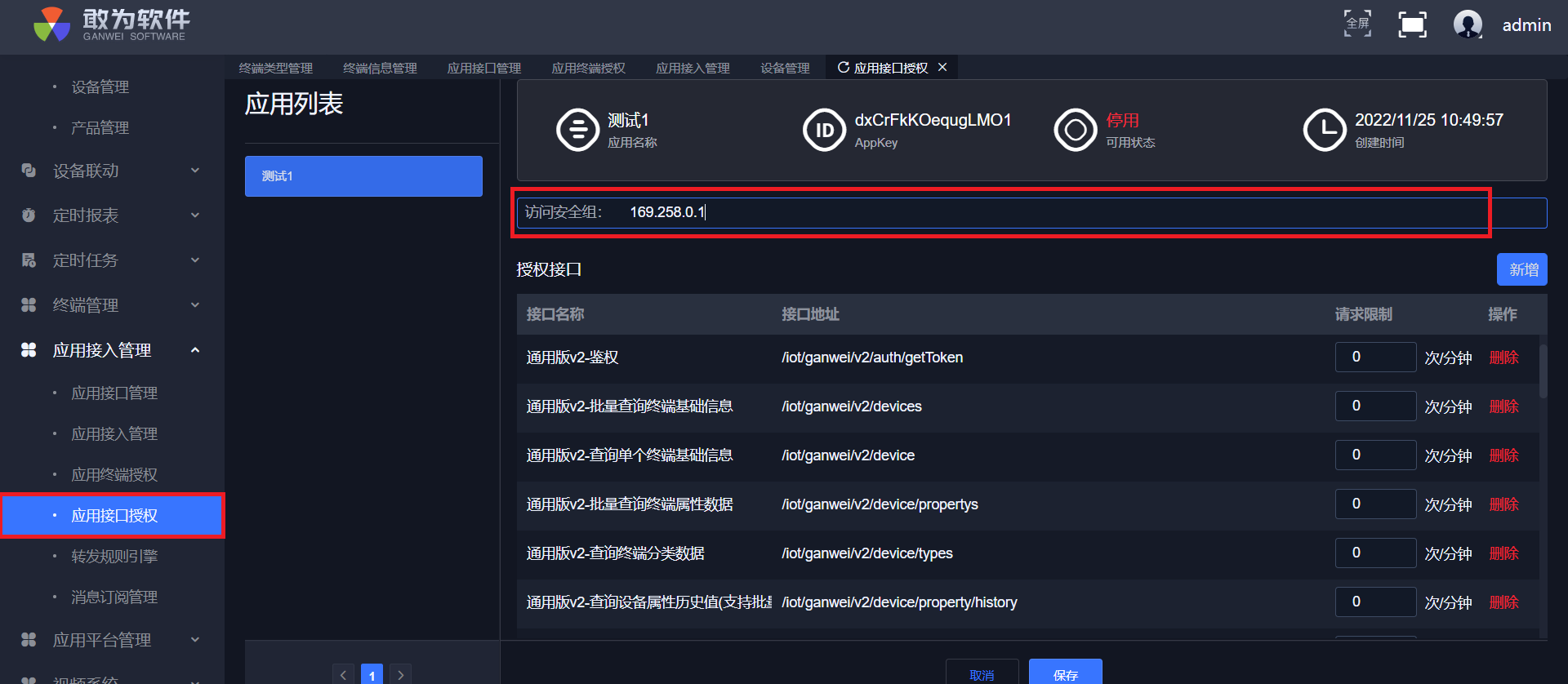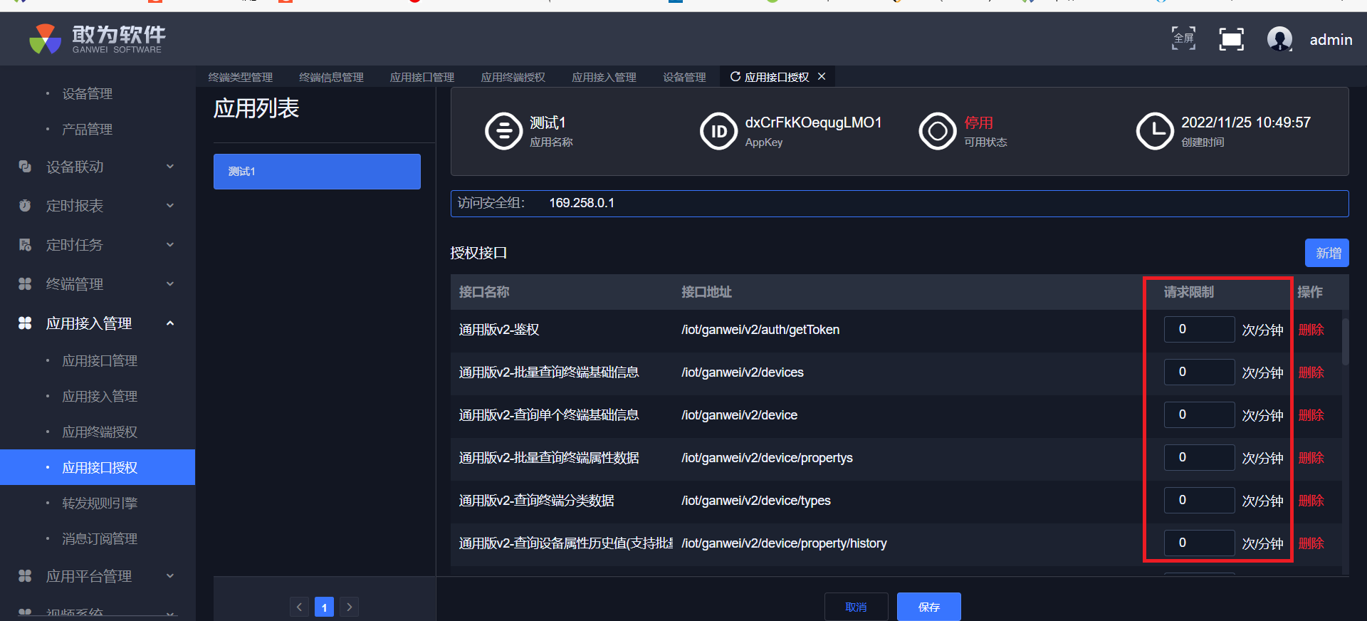 接口访问限制,用户可以选择继续配置请求限制次数。然后点击底部的保存按钮,提交数据到数据库中。