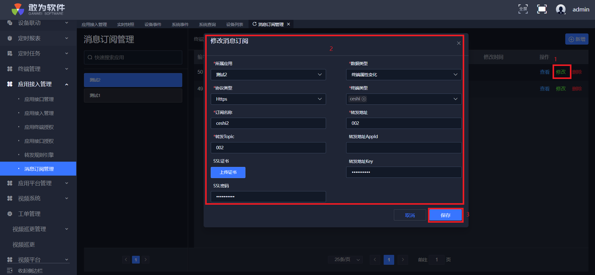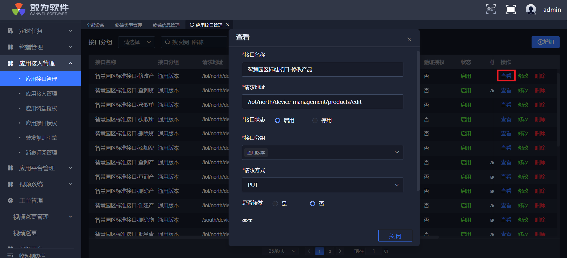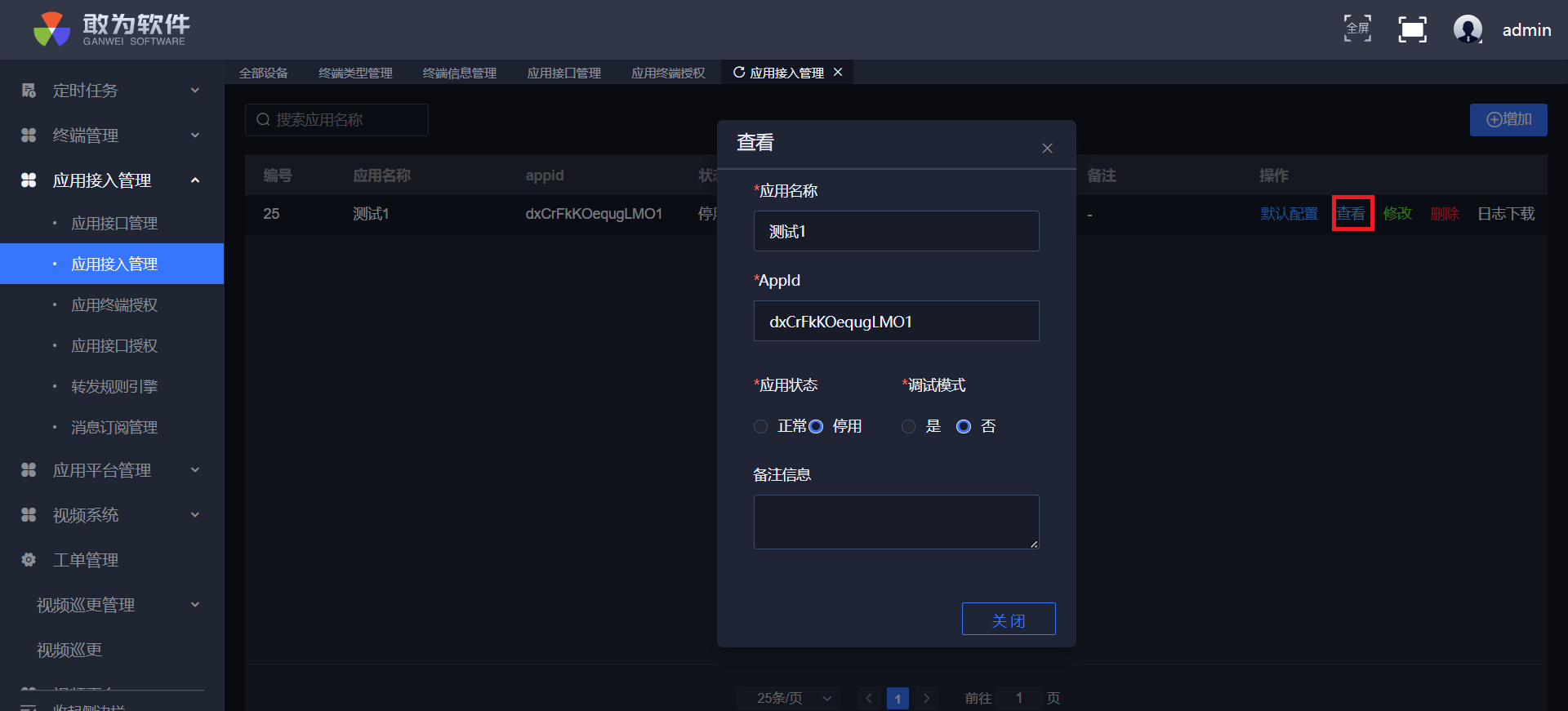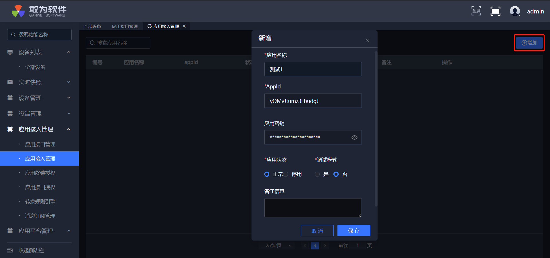 维护北向应用信息,在需要与北向应用进行对接时,在应用接入功能中添加对应应用的信息,该信息中主要包含:应用名称,应用Key,应用秘钥,是否启用等信息。在添加应用时尤其要注意应用key,应用信息创建后无法查看,只能进行修改时查看,因此要妥善保管,在上层应用没有提出需求时不要去修改。