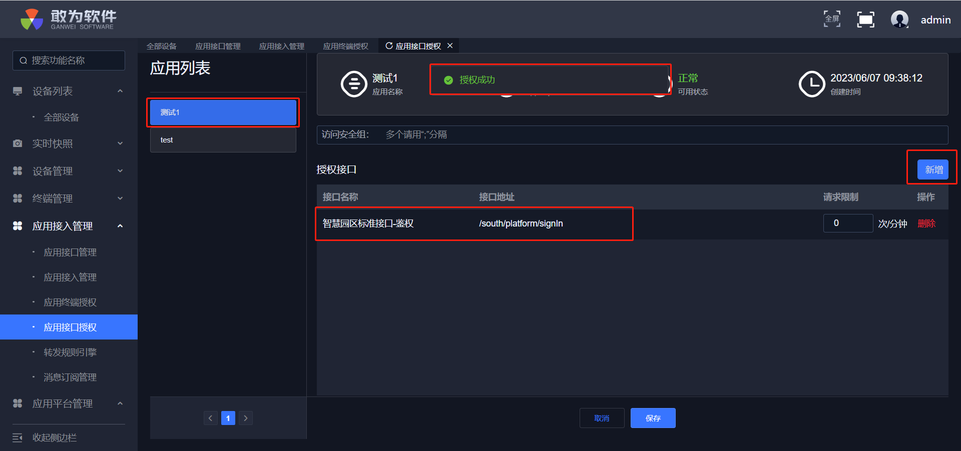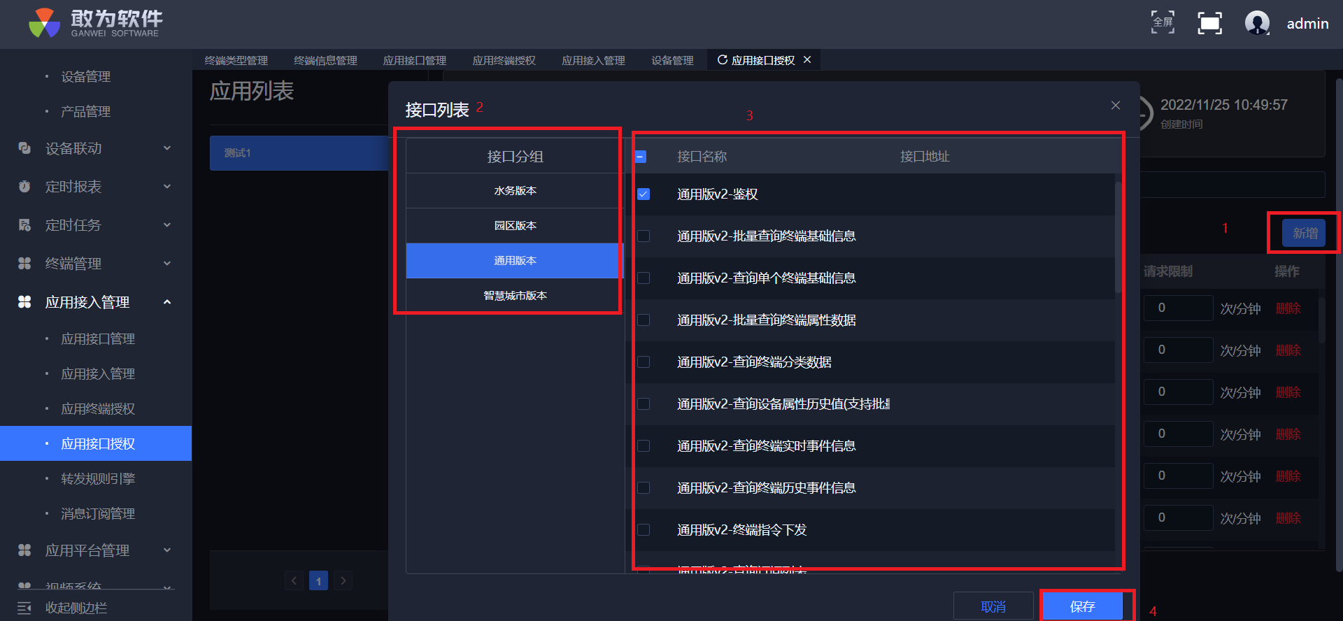 该新增为接口授权新增,先从北向接口库中选择需要授权给应用的接口。选择后会在列表中生成新的记录,如果已经存在不会进行新增。在列表中产生的新纪录并没有保存到数据中