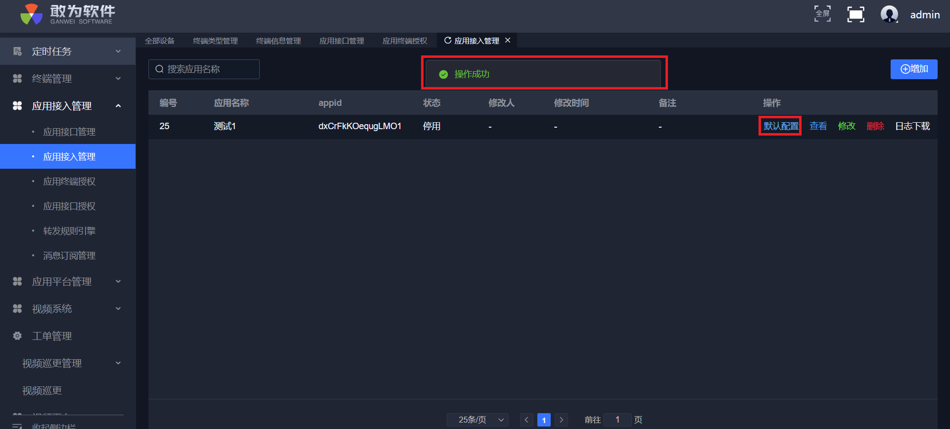 默认配置:该功能实现对应于自动赋予所有终端,自动赋予所有北向通用接口,用于快速配置应用相关数据