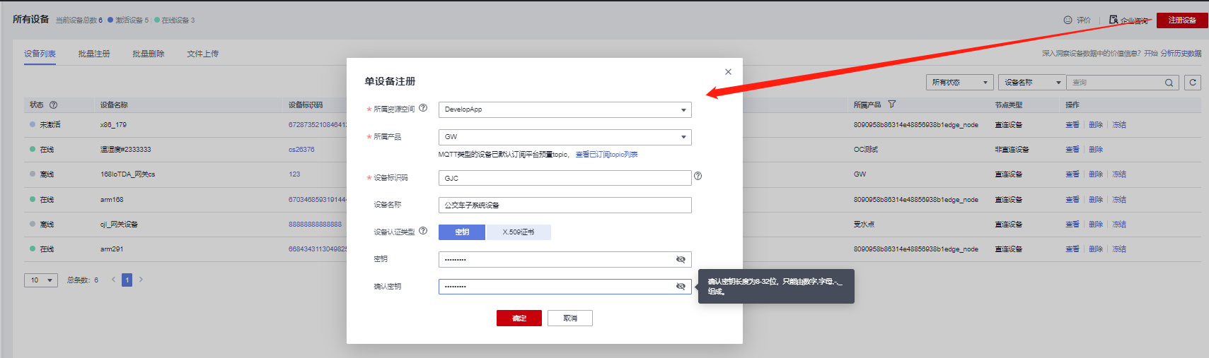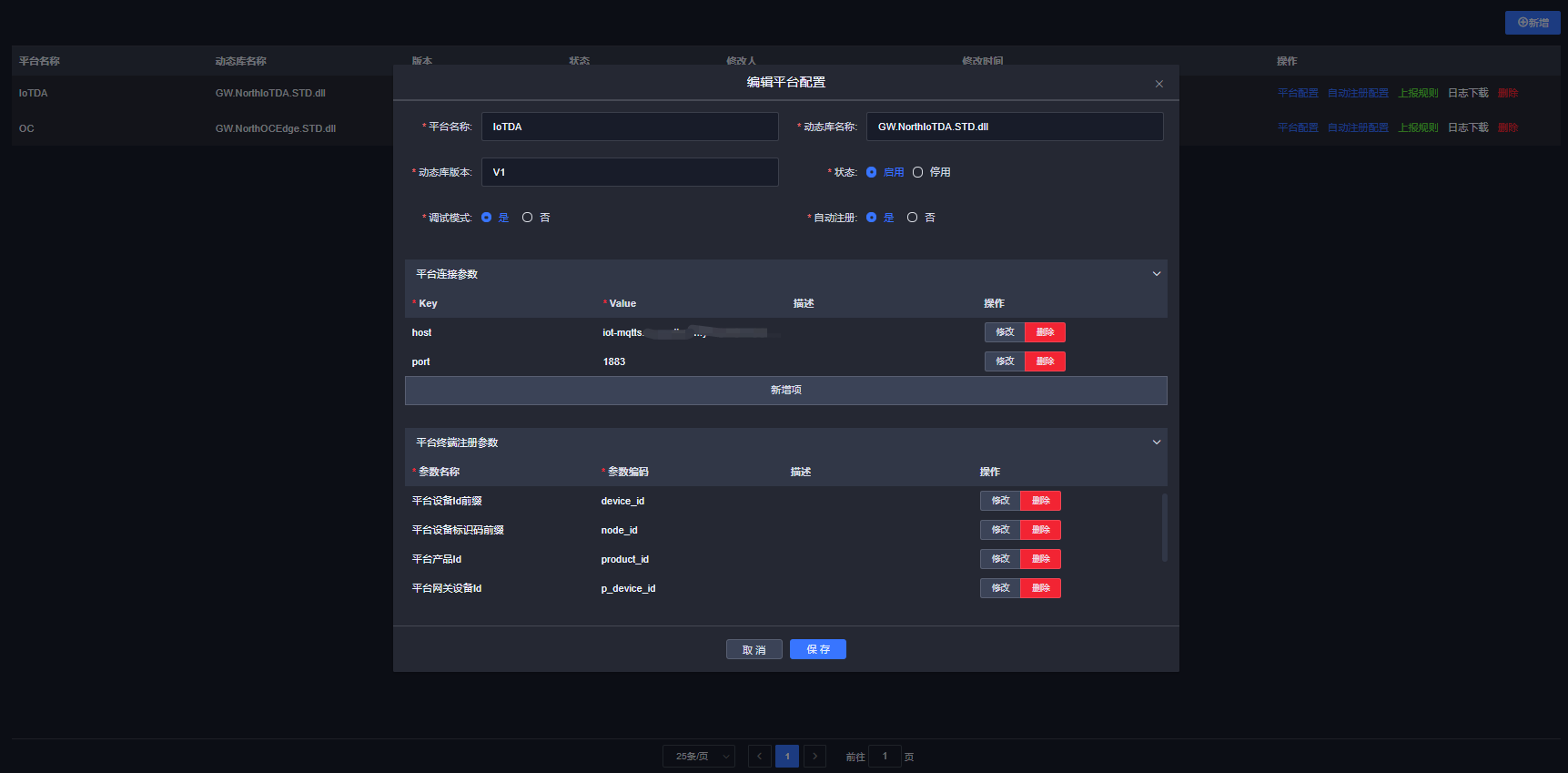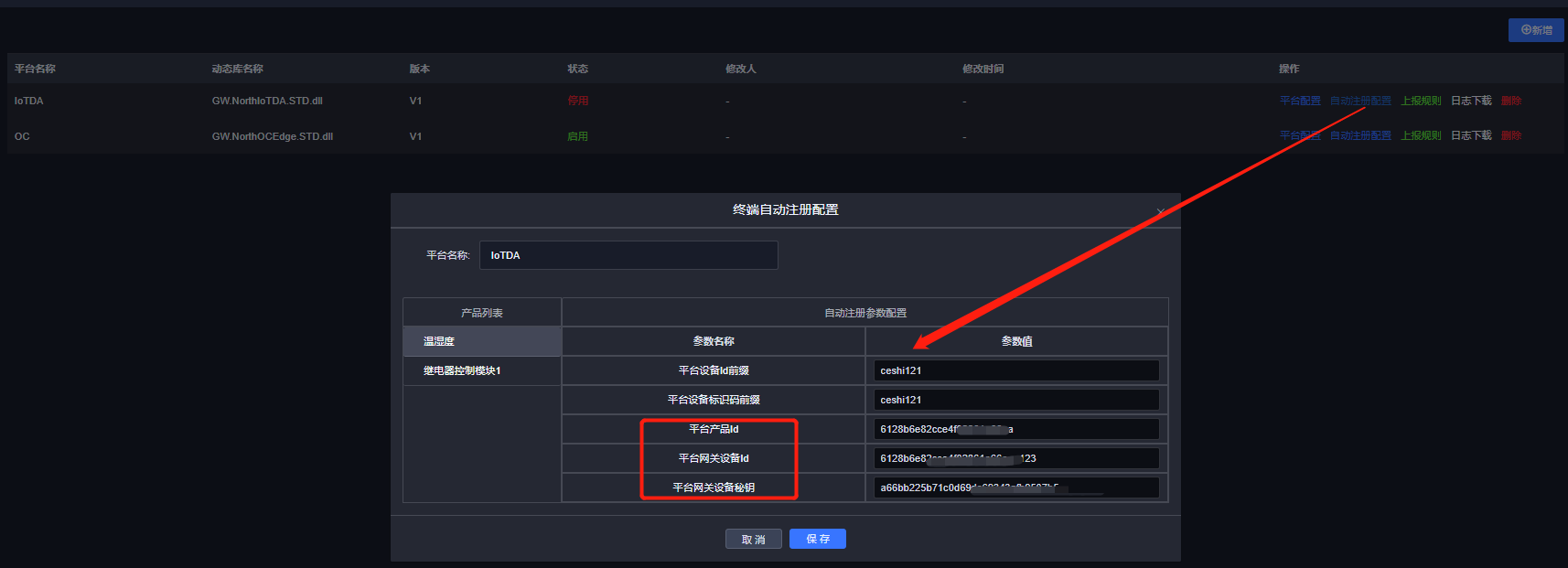 平台配置完成后,终端注册到IoTDA的配置如下: