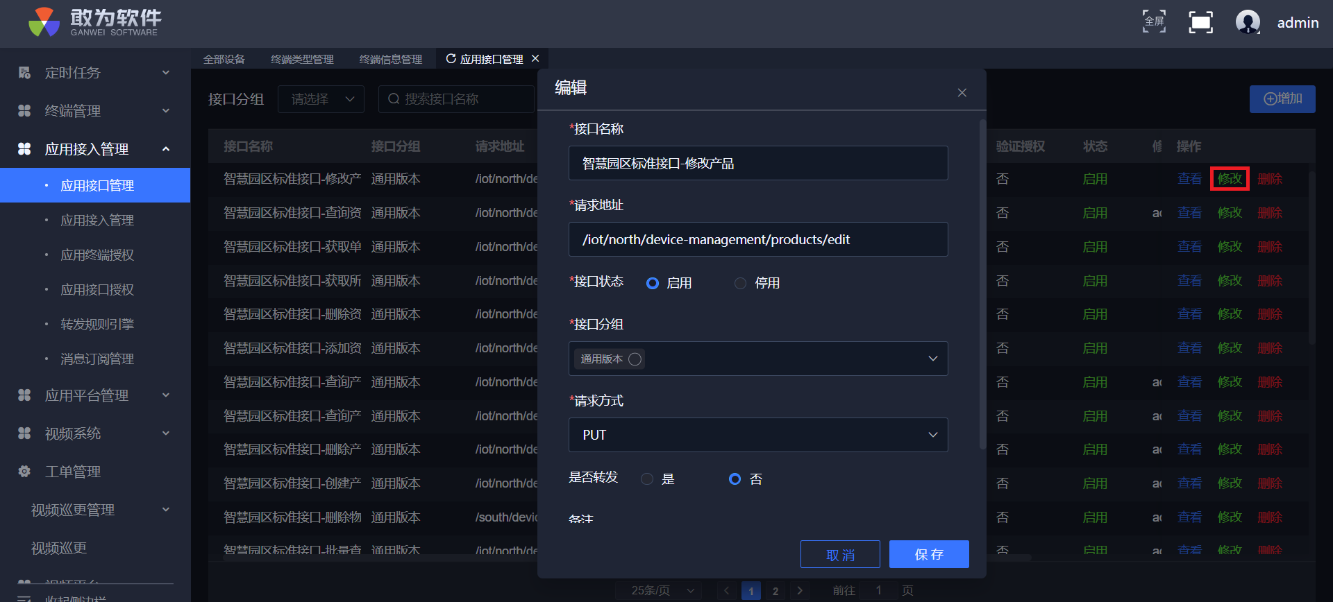 可修改启用停用接口、接口名称、请求地址、接口分组、请求方式