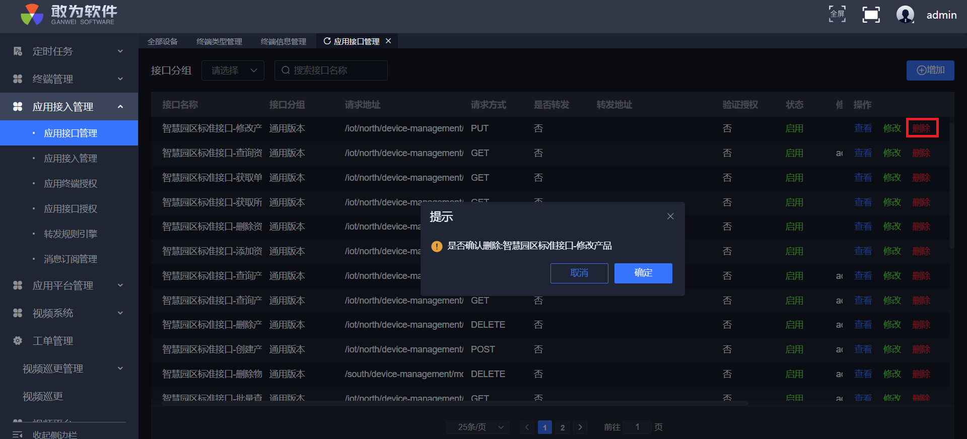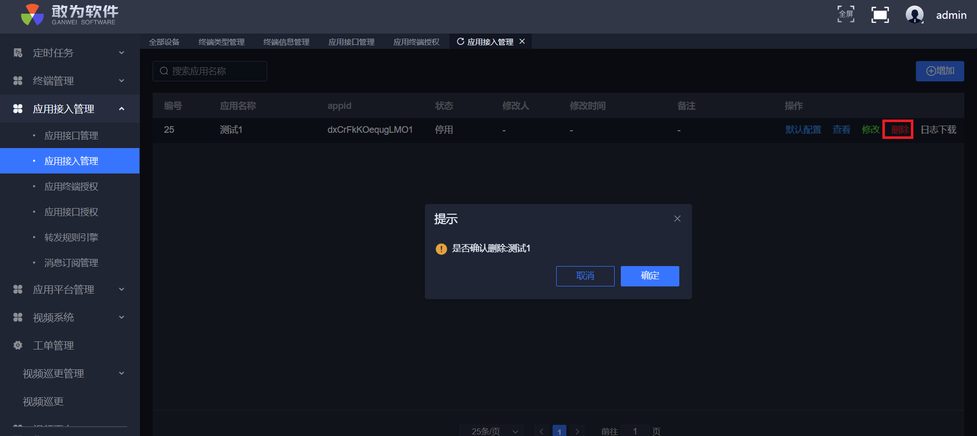 可以删除应用信息,删除的同时,应用无法调用北向接口,北向转发数据也会立即停止。