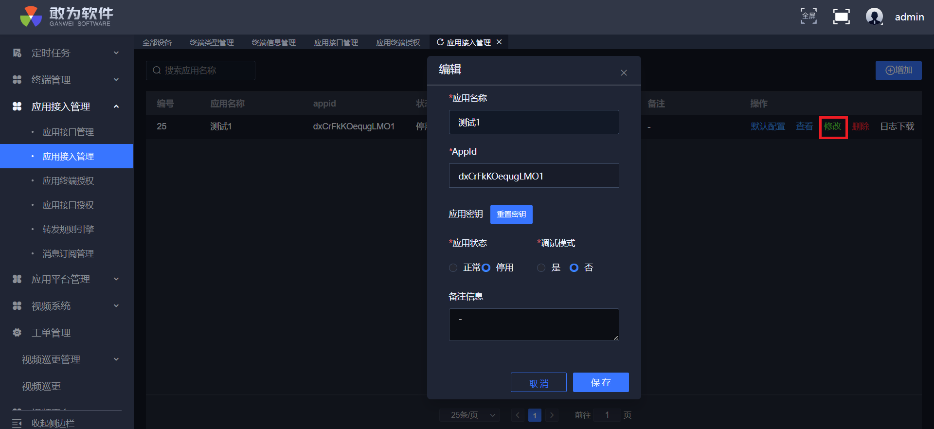 重置密钥:重置应用密码(应用授权),应用状态:启用、停用