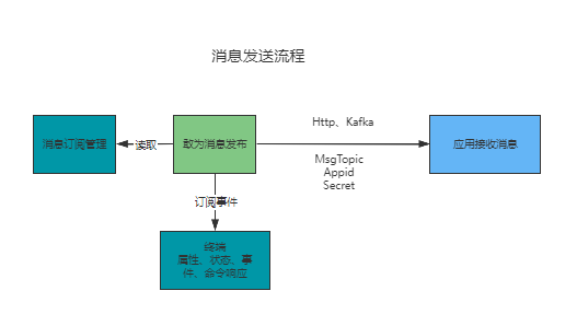 消息订阅主要针对终端实时数据,应用订阅终端实时数据时,需要应用提供接收实时数据的协议地址,可以支持常见的协议如,http,https,kafka等协议。主要的实时消息有4种:终端属性变化(遥测、遥信),终端状态变化(设备状态),终端事件(如报警事件),终端命令响应。在配置消息订阅完成后,敢为根据该配置信息,转发终端的实时数据,以下为消息发送流程: