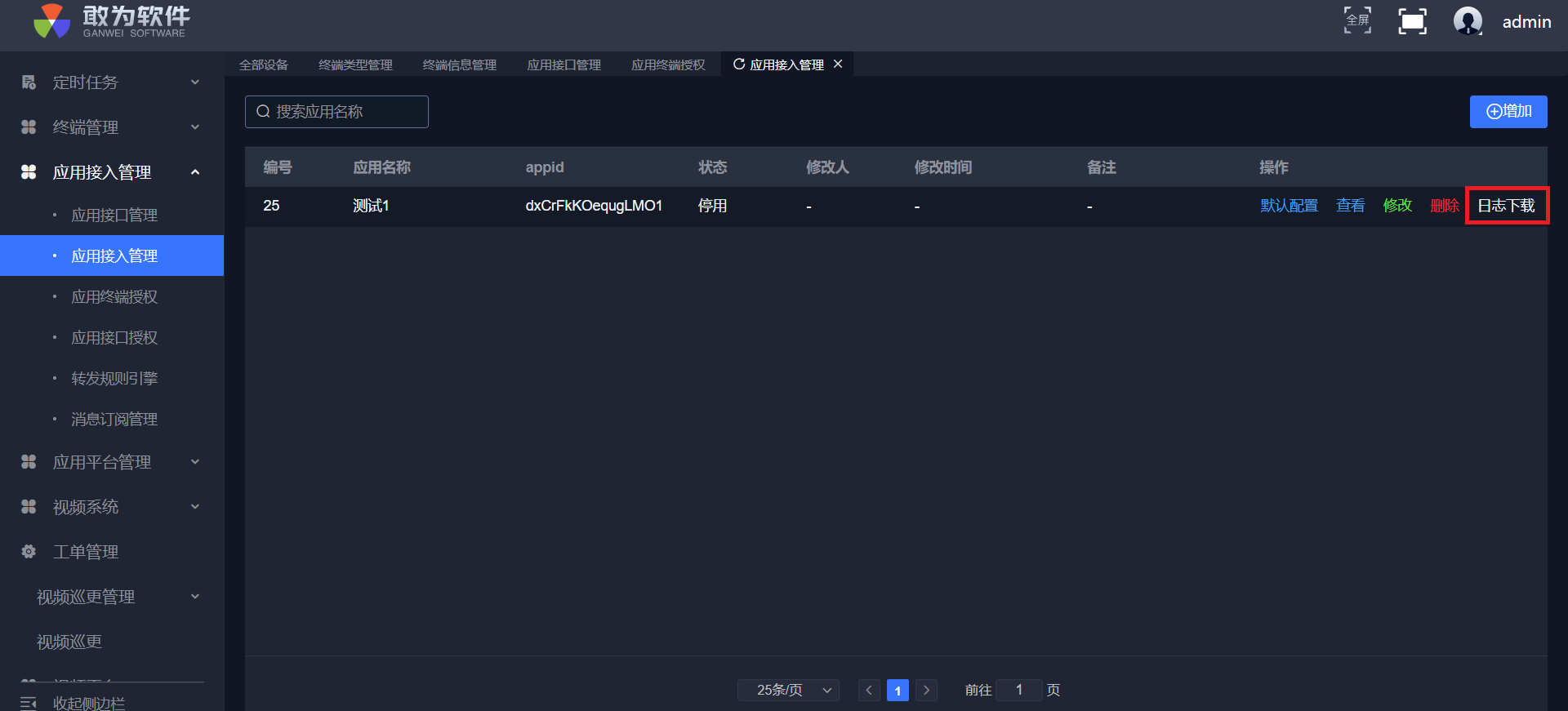 可以下载各个应用产生的日志信息,在应用新增或修改界面,可以配置应用的调试状态,如果选择调试模式,会将Info级别的日志写入日志文件中。否则只记录Warning级别的日志,在与应用联调时,可以将调试模式开启,等待接入完成后,关闭调试模式。