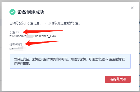 创建直连设备:需要将设备Id和设备秘钥记住,后面在敢为注册设备时需要用到。