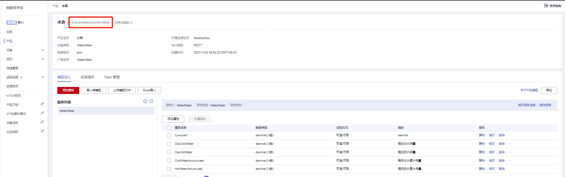 平台产品Id:在华为IoTDA平台中,创建产品后,会有一个产品Id,如下图所示: