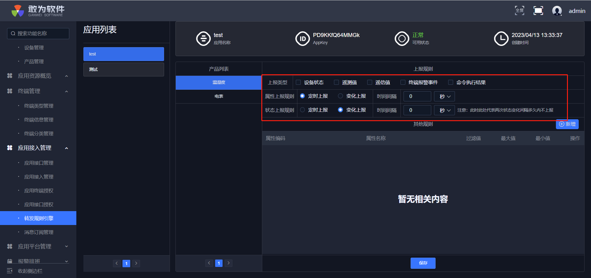 北向应用需要IoT平台推送实时数据时,用户可以按产品配置转发规则,如产品为温湿度的终端,应用需要设备状态、遥测、遥信的实时值,需要在状态、遥测、遥信变化时上报数据;并且对产品属性的数据配置过滤值,如终端属性的wendu,有效值在10-100范围内,并且过滤为88的值才会进行上报。