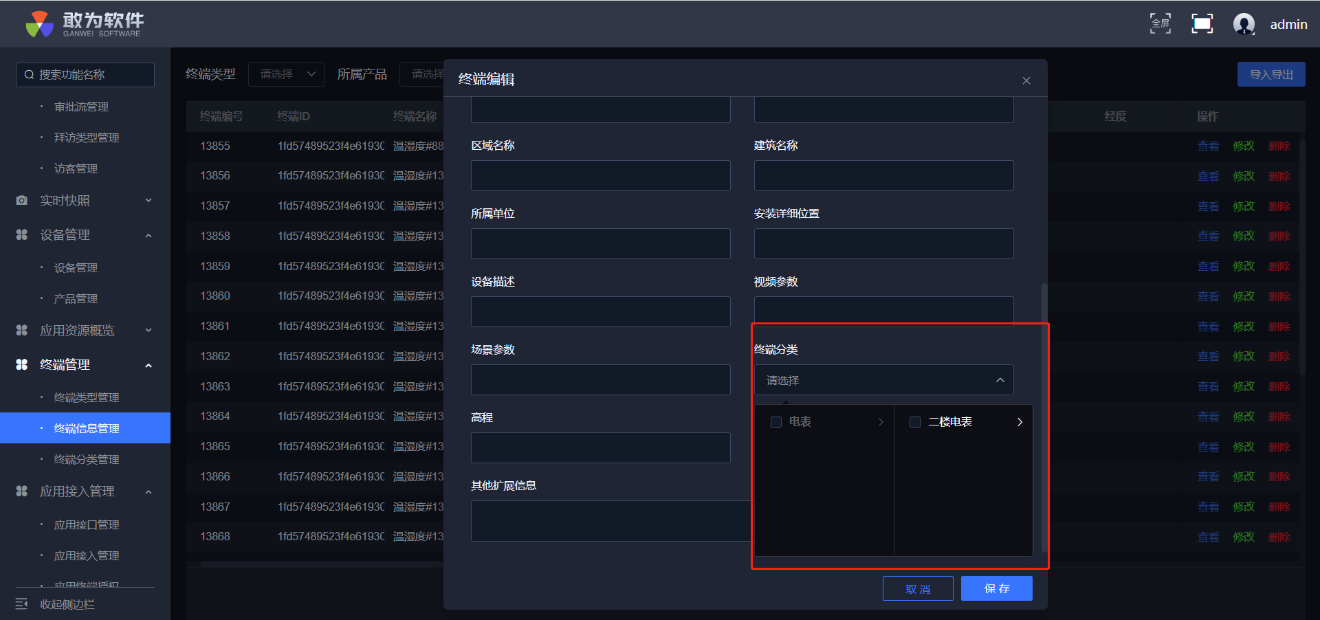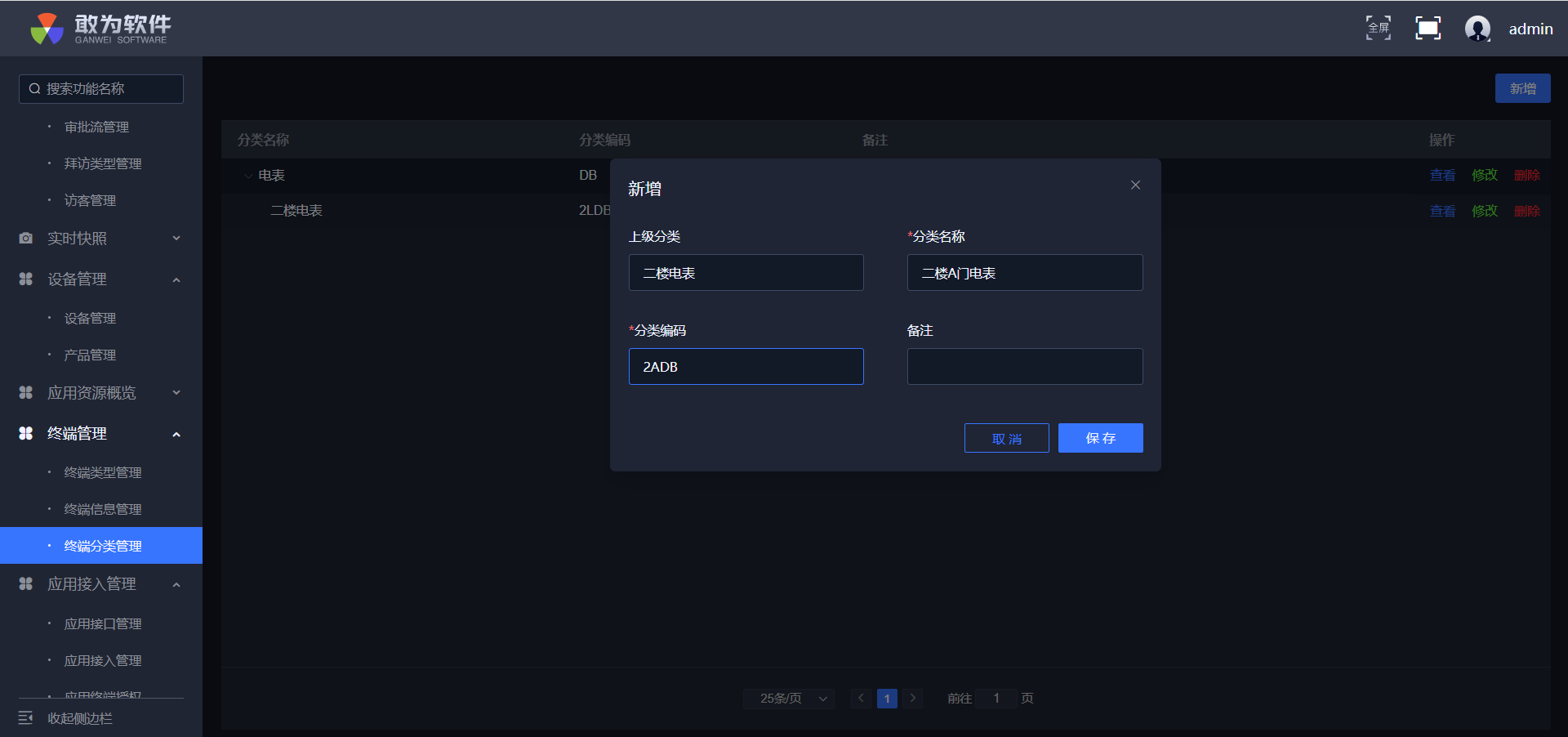 可根据业务需求新增终端分类数据,可以在终端信息管理中配置终端的终端分类