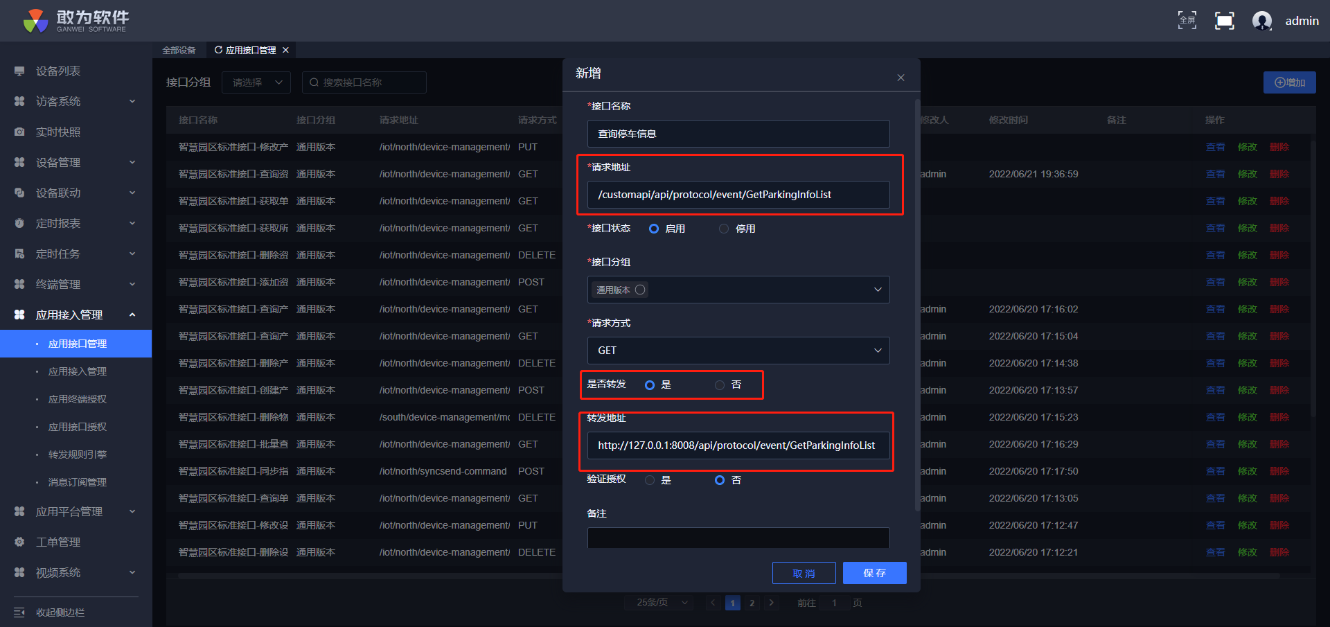转发地址: 填入插件中暴露的接口,此处应填入http://127.0.0.1:8008/api/protocol/event/GetParkingInfoList