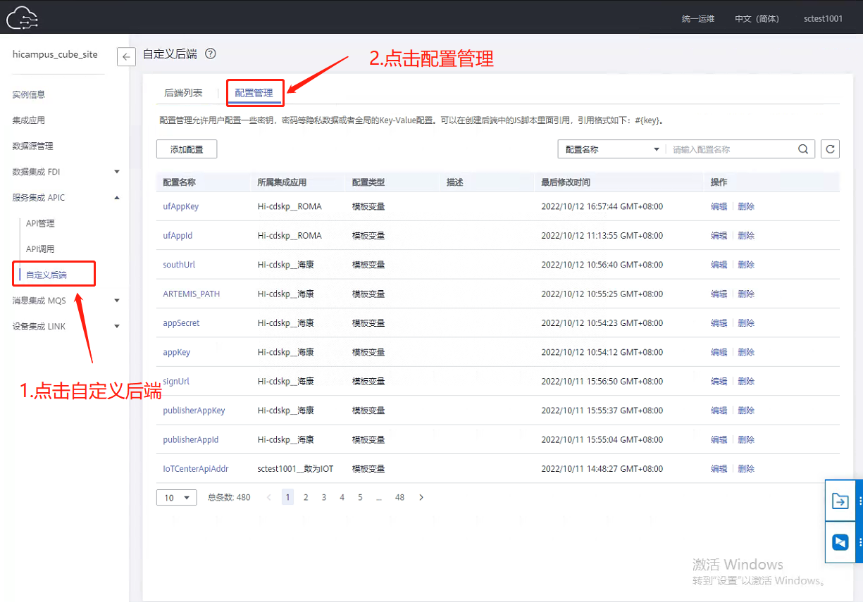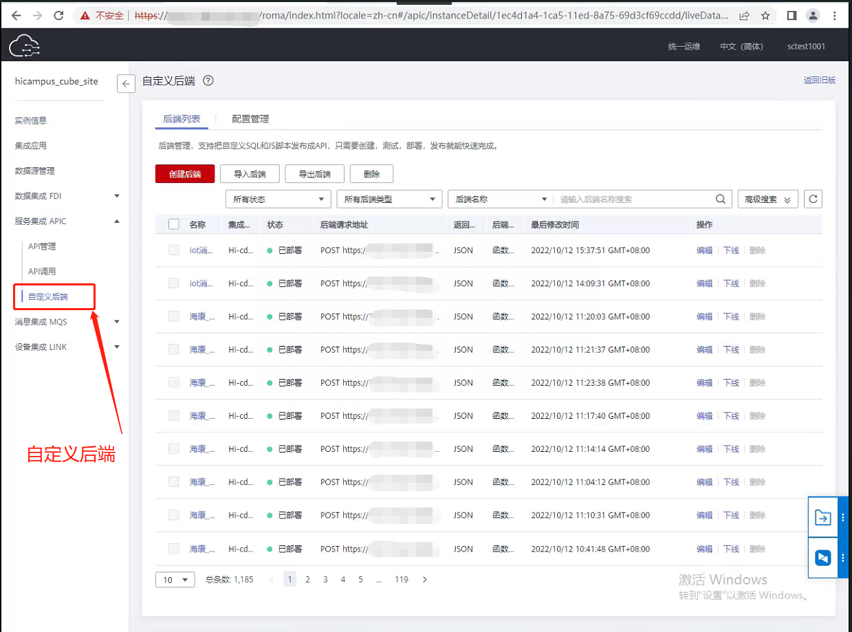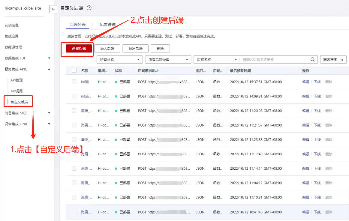 在配置接口前需配置接口后端地址信息。 第一步:进入【自定义后端】页面,点击配置管理。