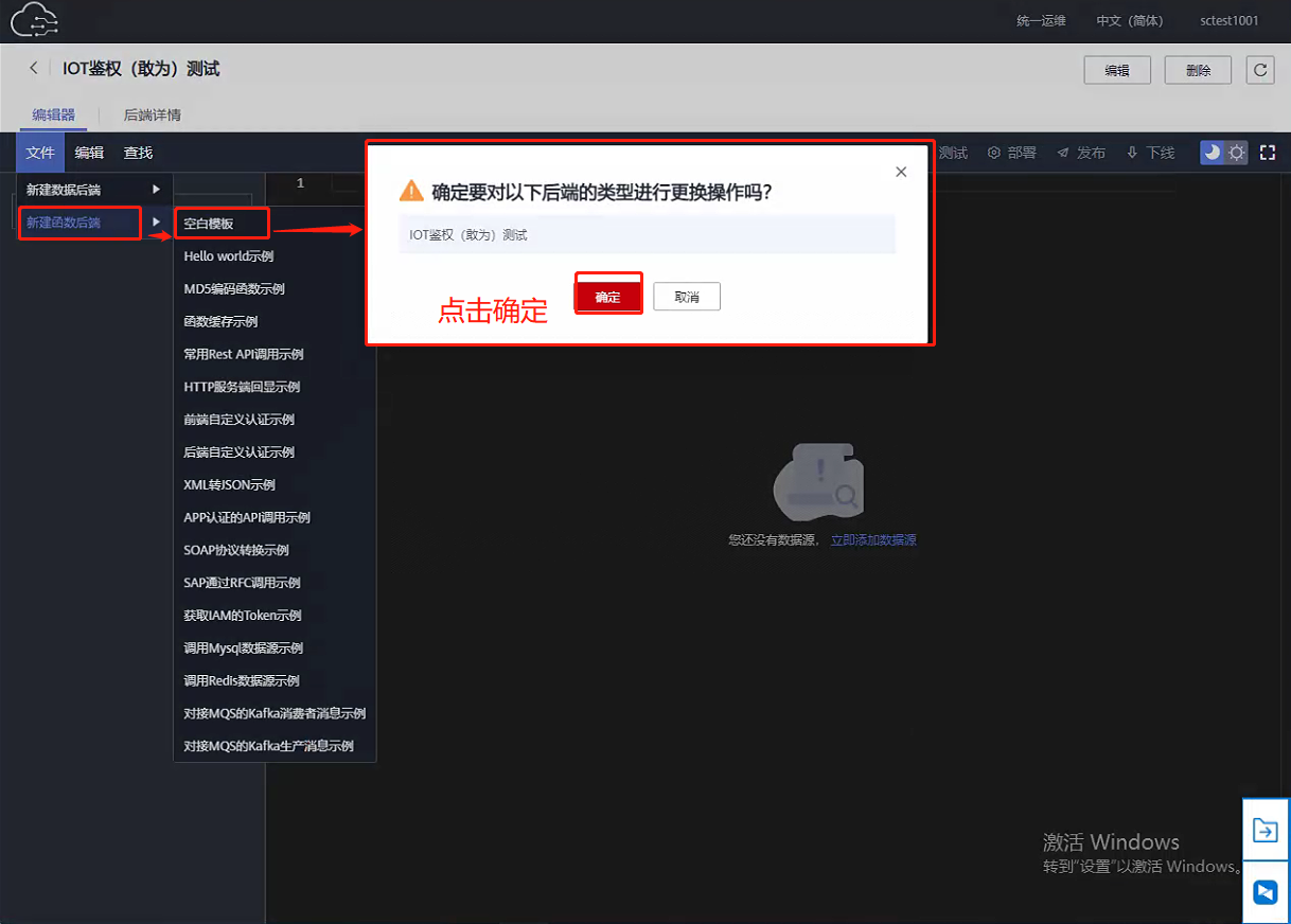 第三步:填写完成后,点击右下角的【立即创建】,跳转至下一页面 选择【新建函数后端】,选择空白模板,弹出确认框,点击【确认】。