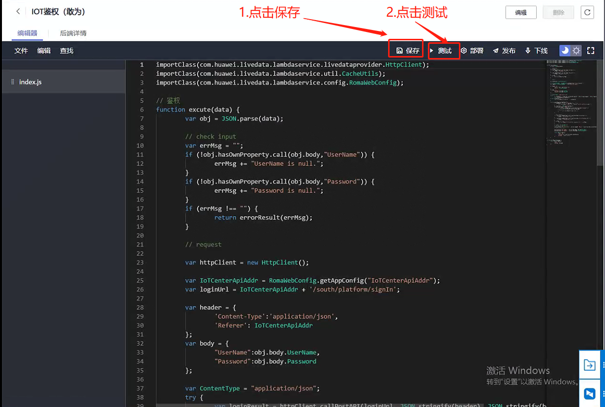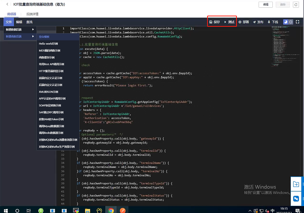 第五步:点击右上角导航条处【保存】,再点击【测试】。(测试接口是否可正常使用)