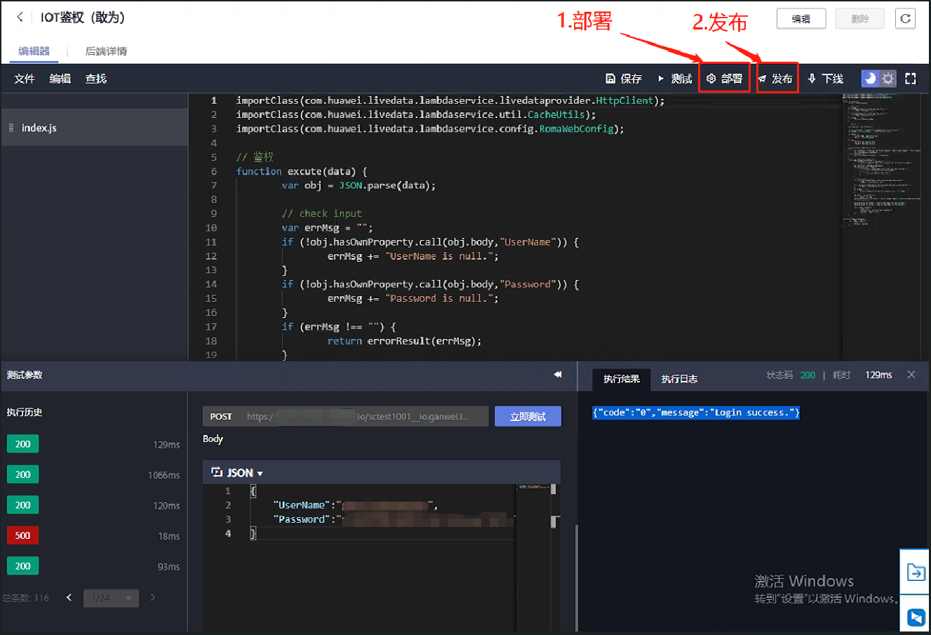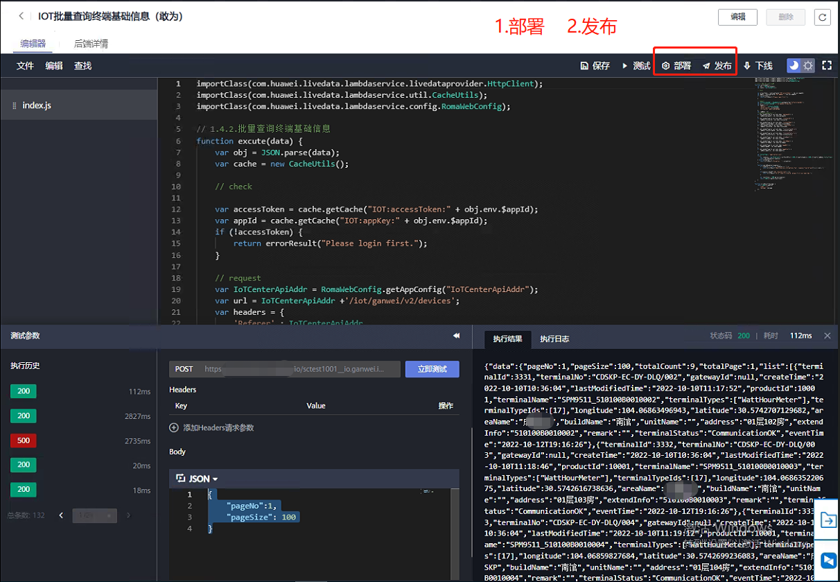 第五步:测试结果正常后,点击右上角【部署】,再点击【发布】