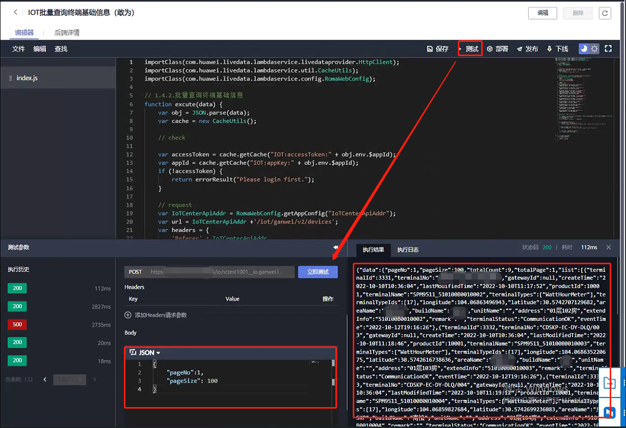 创建API接口 自定义后端接口创建及配置与上述“IOT批量查询终端基础信息” 配置相同。