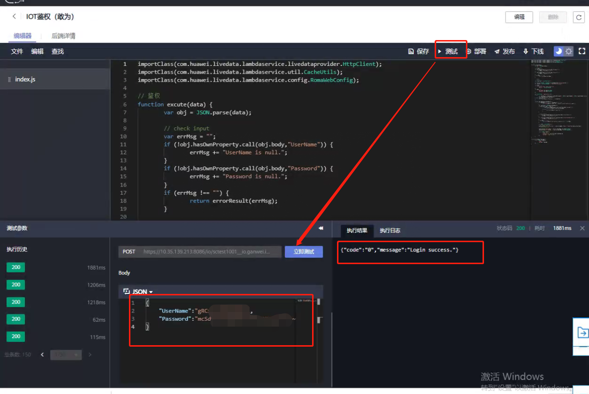 点击【保存】,再点击【测试】,在body处传参,点击测试,结果如下证明成功。