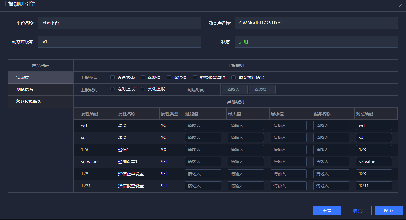 在本方案中,物模型是非常重要的配置信息,是联系真实世界和虚拟世界的纽带。系统中包含两种物模型,一种是由IoTCenter进行直接管理的物模型,即IoTCenter产品信息、设备信息(含遥测、遥信、设置),一种是通过IoTCenter映射生成目标物模型,如EBG的物模型,或华为云IoTDA管理的物模型。