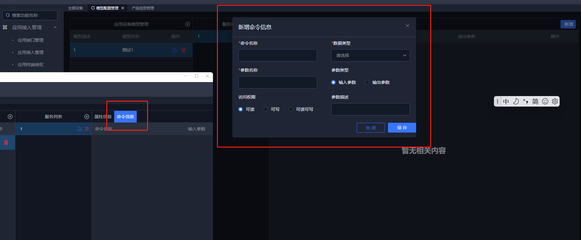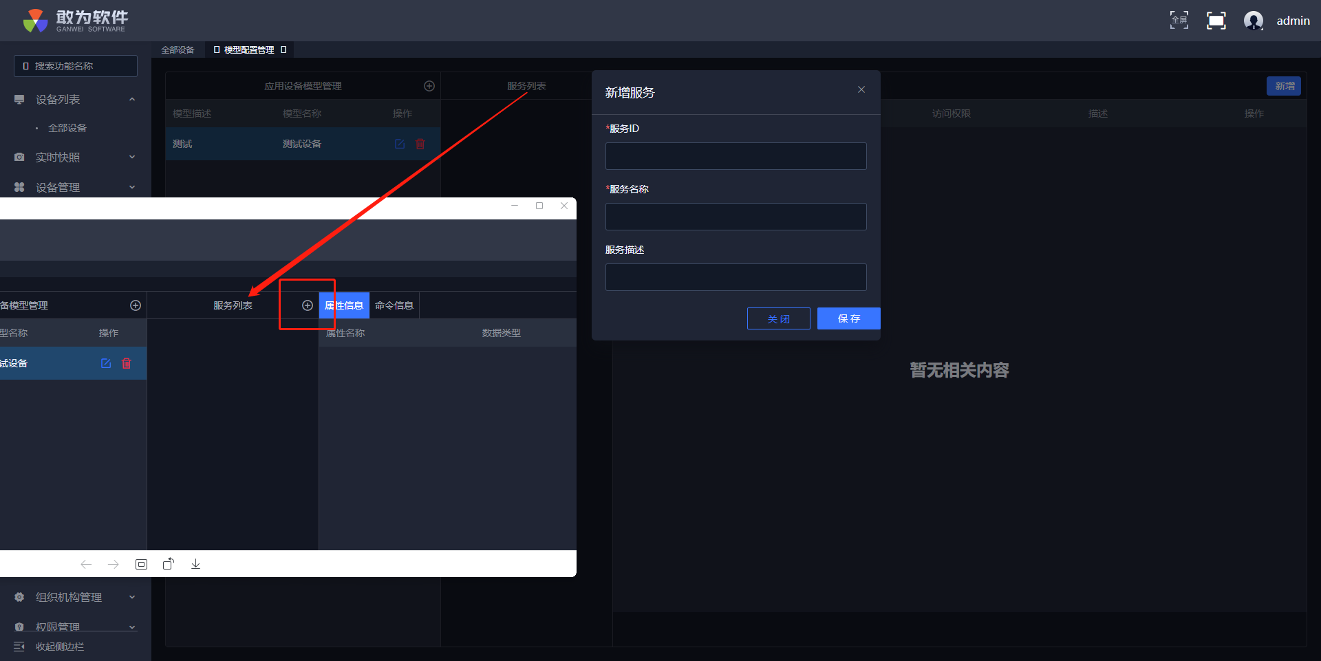 选中添加的物模型,点击图标打开对话框新增一个服务。