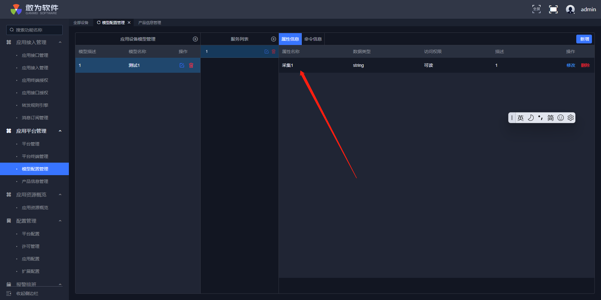 然后在服务中添加一个属性信息,属性信息对应产品中的遥测点
