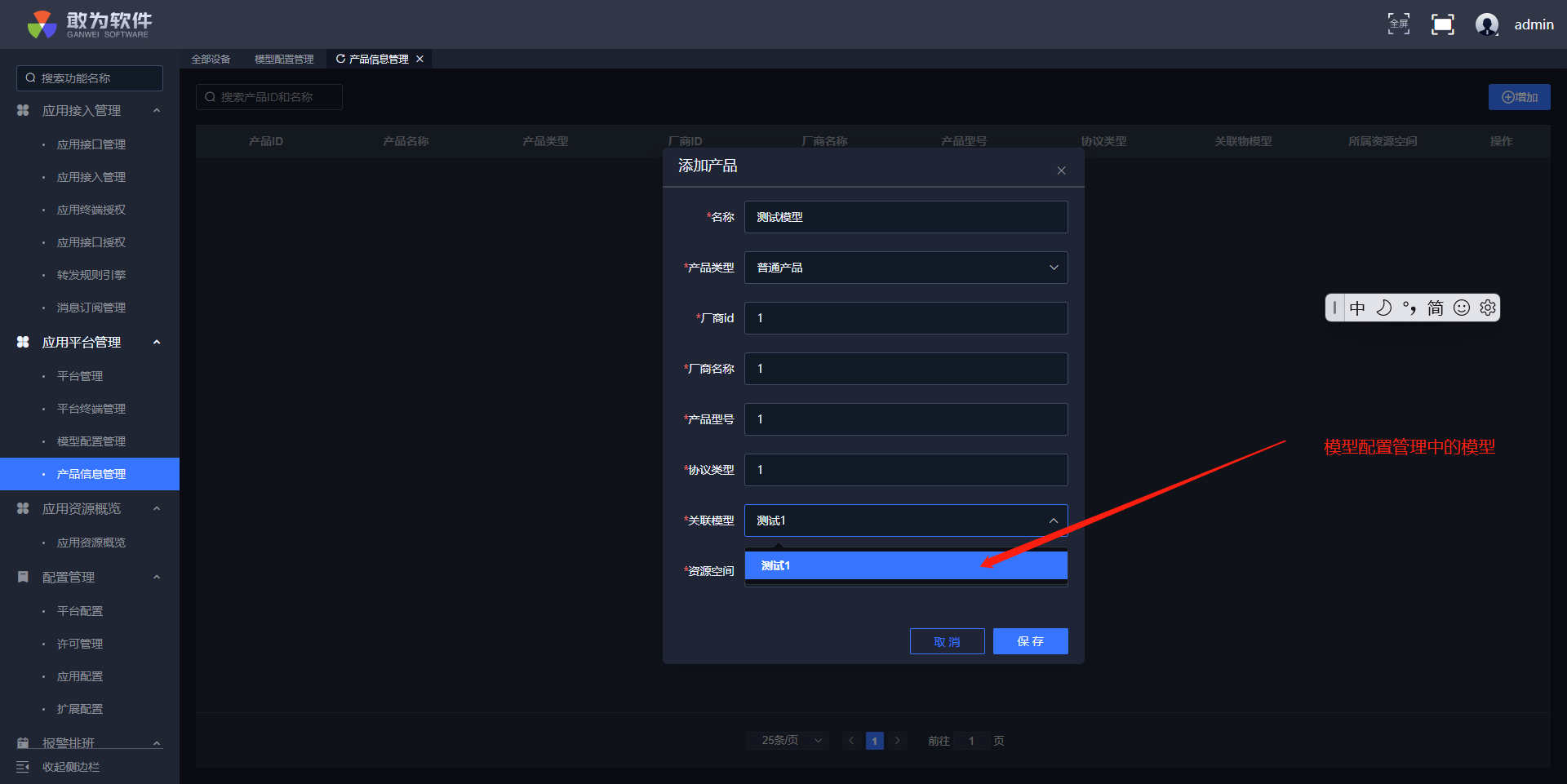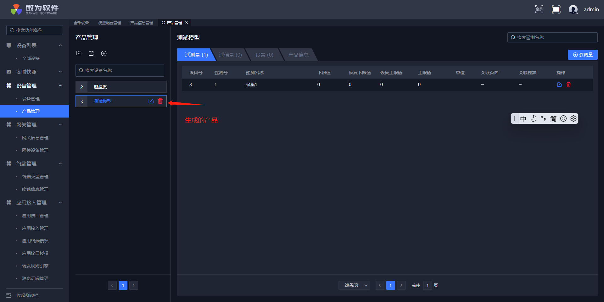 当物模型设置好之后,就可以进入产品信息管理界面对模型进行绑定,绑定之后就会在产品管理中生成对应的产品。
