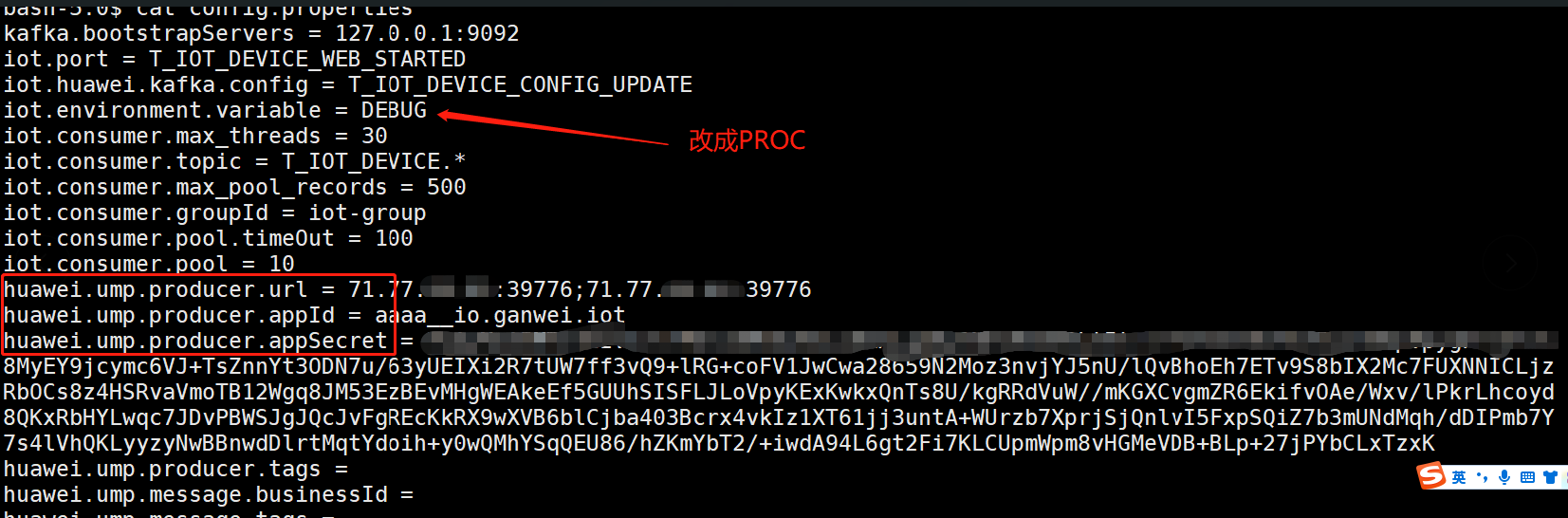 huawei.ump.producer.appSecret为RomaSDK 连接密钥,22.1版本为明文,22.2版本为图中所示采用使用敢为平台加密工具-【使用高级AES加密】生成的字符串,详见《安装部署文档-使用高级AES加密字符串》。以上三项如果采用Cube流水线部署,将会被自动配置,若手工部署,则需手工导入配置,以上三项都可以在ROMA平台中拿到。