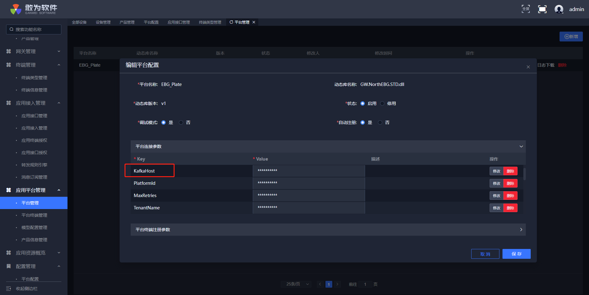 - 4、 前面检查都没问题的话,基本可判定是roma那边的问题,反馈给roma处理。 2.2.7.3. 对接Roma Kafka(只适用于22.2后续版本) 目前在IoTCenter Ebg版本中默认集成的版本为Roma SDK,从22.2开始,Roma产品也可以通过Kafka进行直接对接,实际使用时启用直接对接ROMA的kafka的方法是通过修改IoTCenter界面中的应用平台管理中的平台管理中内置的EBG_Plate平台来实现的。 通过修改平台参数,将默认的kafka地址修改成roma的kafka地址、用户名及密码。
