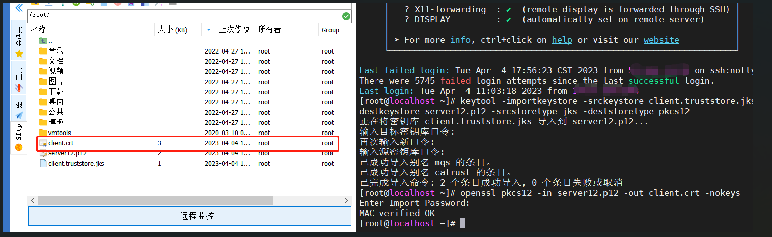 openssl pkcs12 -in server12.p12 -out client.crt -nokeys (密码见上)