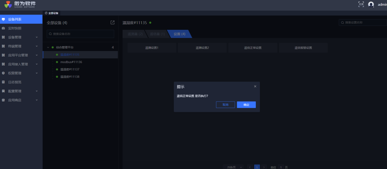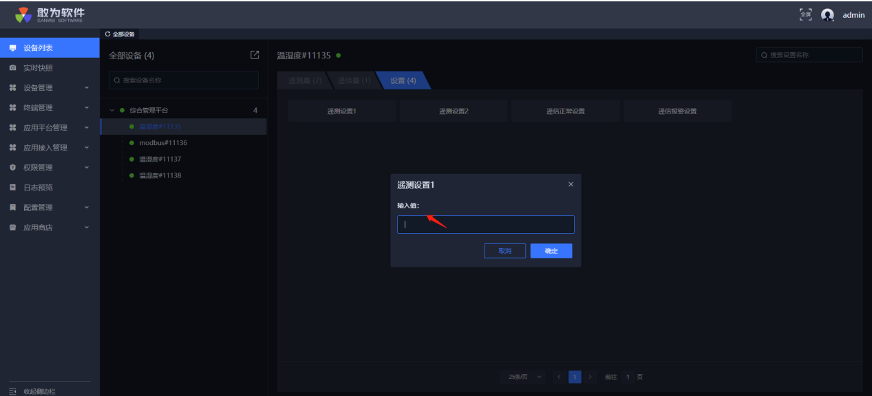 设置类型为输入参数设置:输入设置值,点击确定;设置类型为设备遥信设置,点击确定。