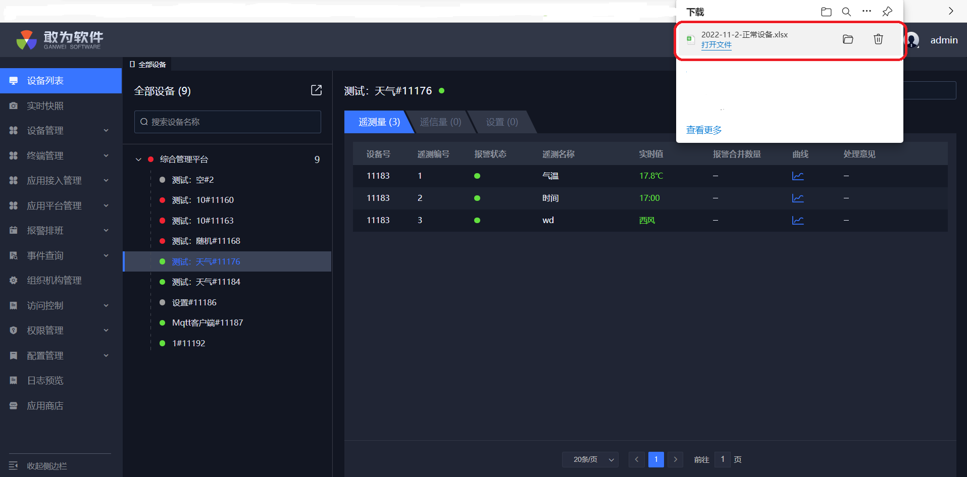 在浏览器下方会出现已导出设备的文件,文件名规则:日期-告警/离线设备.xlsx,可打开文件查看导出的设备数据。