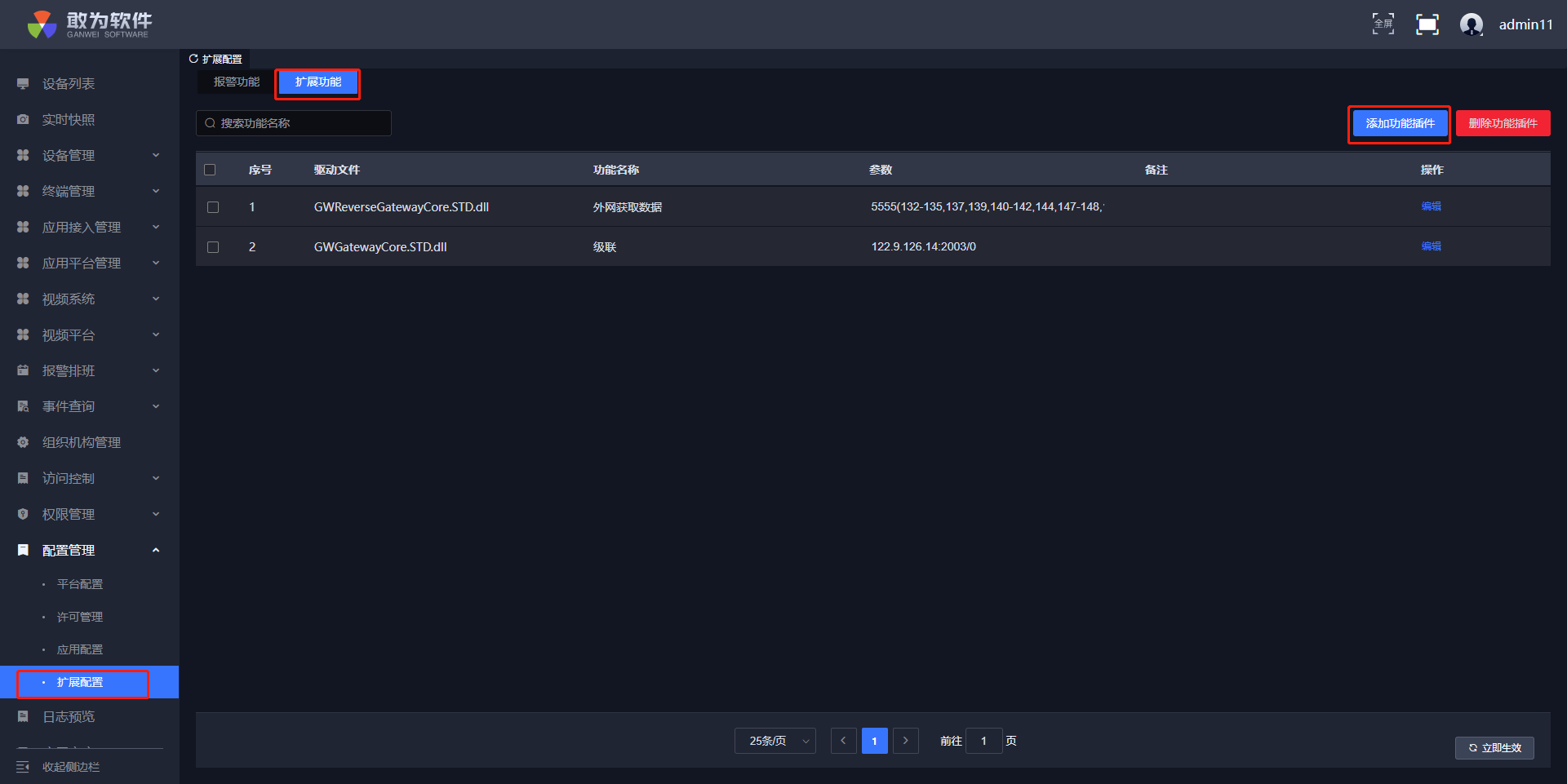 登录平台后点击配置管理菜单中的扩展配置子菜单,在打开的扩展配置页面中点击扩展功能选项卡。点击右上角的添加功能插件按钮。