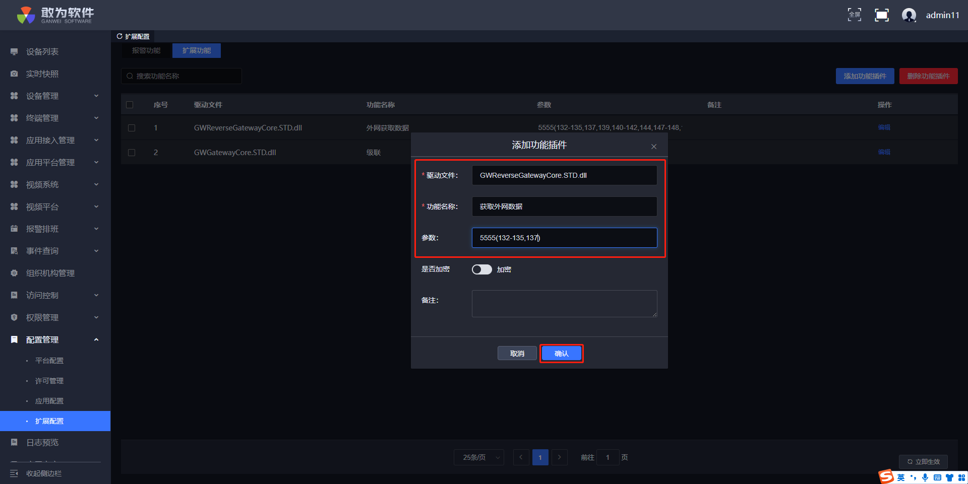 在打开的添加功能插件窗口中输入驱动文件、功能名称以及参数。输入完成后点击确定按钮进行保存。