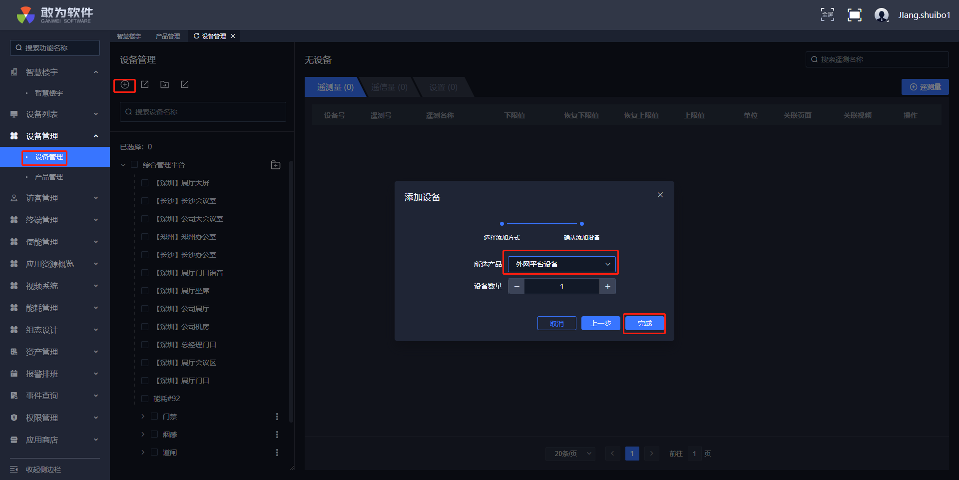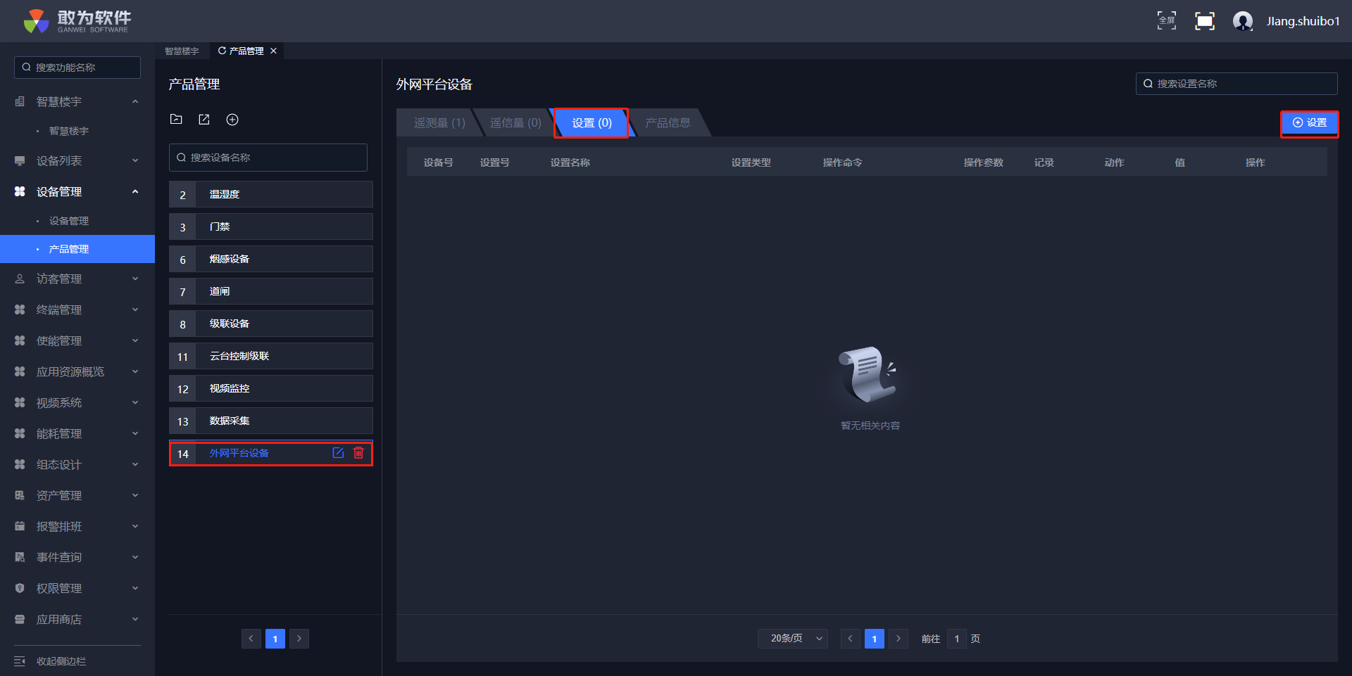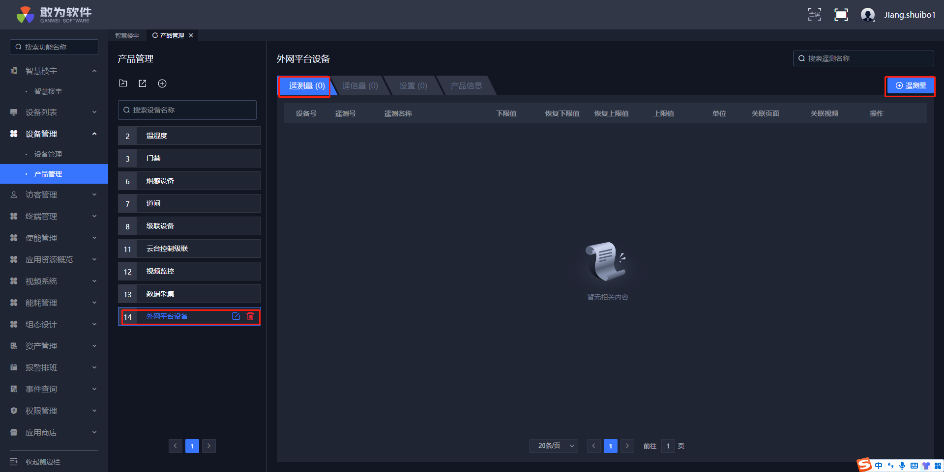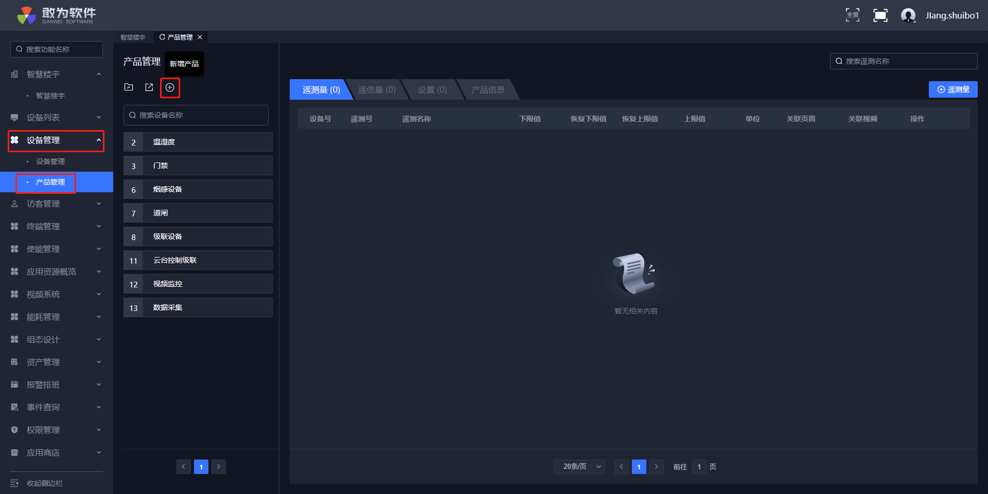 在产品列表中选中新增的产品,点击遥测量选项卡后,点击右上角的新增遥测量按钮。