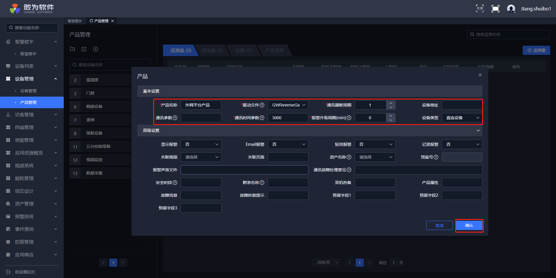 在打开的产品窗口中输入产品名称、通讯时间参数,选择驱动文件等相关配置。输入完成后点击确定按钮完成产品的新增。