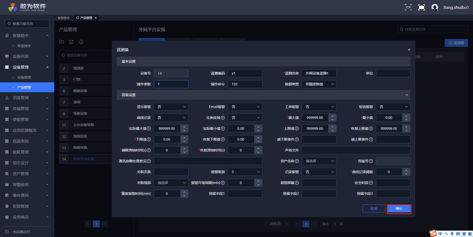 在打开的遥测量窗口中,除了操作命令与操作参数外,其它配置按照外网平台对应遥测量进行配置。配置完成后点击确定按钮完成遥测量的添加。